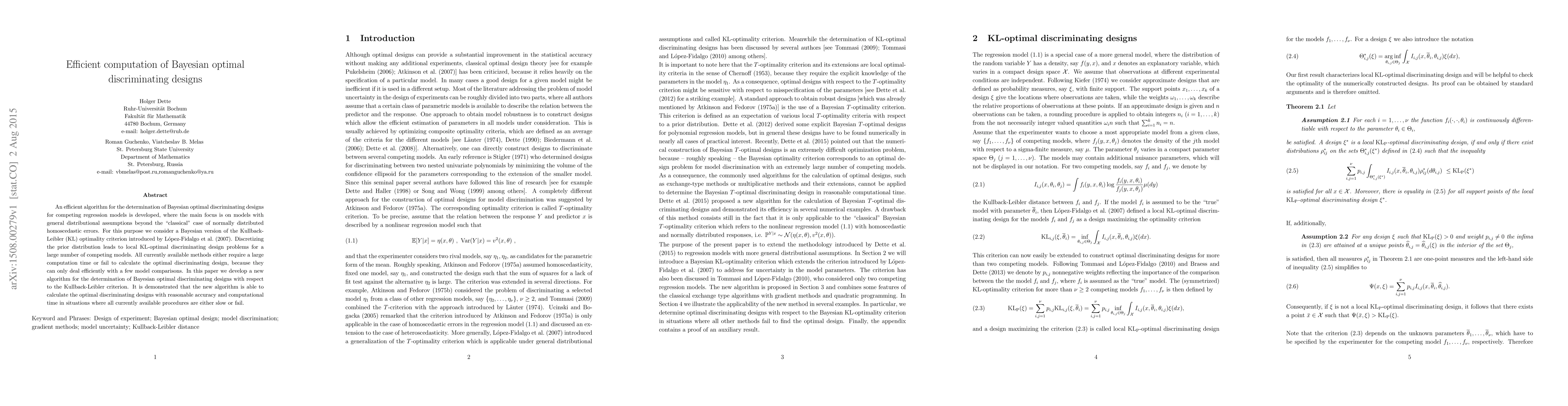 This paper develops an efficient algorithm for computing Bayesian optimal discriminating designs for competing regression models under general distributional assumptions. The new method effectively addresses the limitations of existing approaches, providing accurate results with significantly reduced computation time.