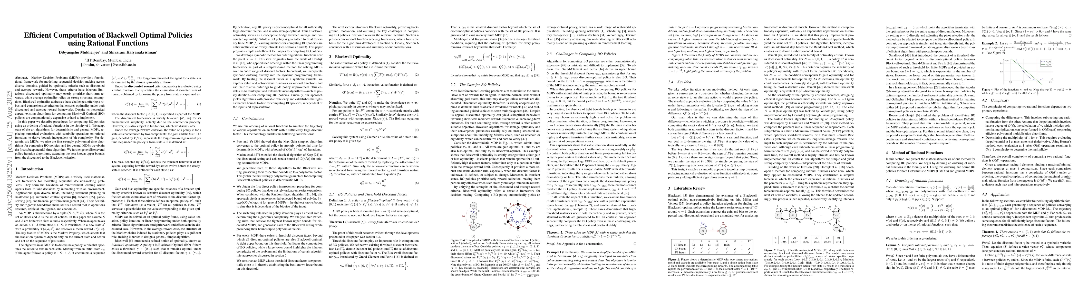 Markov Decision Problems (MDPs) provide a foundational framework for modelling sequential decision-making across diverse domains, guided by optimality criteria such as discounted and average rewards. However, these criteria have inherent limitations: discounted optimality may overly prioritise short-term rewards, while average optimality relies on strong structural assumptions. Blackwell optimality addresses these challenges, offering a robust and comprehensive criterion that ensures optimality under both discounted and average reward frameworks. Despite its theoretical appeal, existing algorithms for computing Blackwell Optimal (BO) policies are computationally expensive or hard to implement. In this paper we describe procedures for computing BO policies using an ordering of rational functions in the vicinity of $1$. We adapt state-of-the-art algorithms for deterministic and general MDPs, replacing numerical evaluations with symbolic operations on rational functions to derive bounds independent of bit complexity. For deterministic MDPs, we give the first strongly polynomial-time algorithms for computing BO policies, and for general MDPs we obtain the first subexponential-time algorithm. We further generalise several policy iteration algorithms, extending the best known upper bounds from the discounted to the Blackwell criterion.