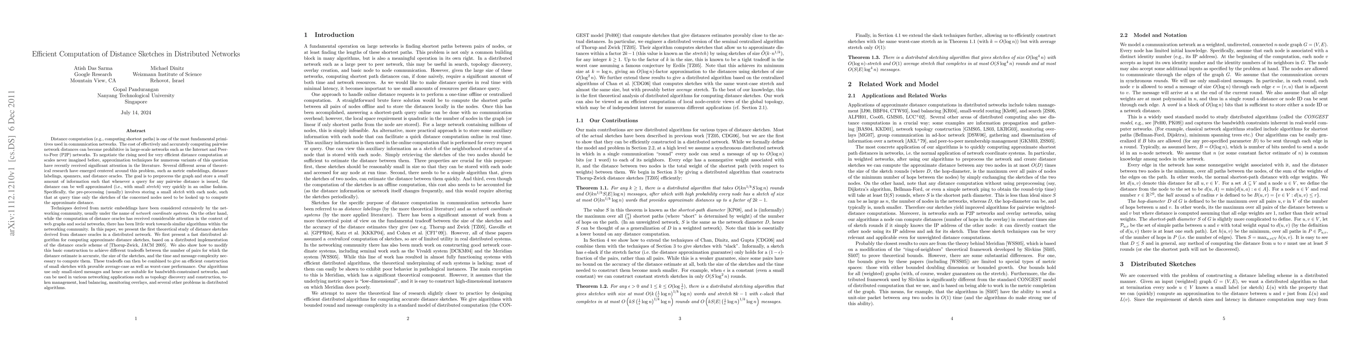 This paper presents a theoretical study on efficient computation of distance sketches in distributed networks, introducing a fast distributed algorithm for computing approximate distance sketches based on a distributed distance oracle scheme. The proposed method achieves a balance between accuracy and computational efficiency, suitable for bandwidth-constrained networks and applicable to various networking applications.