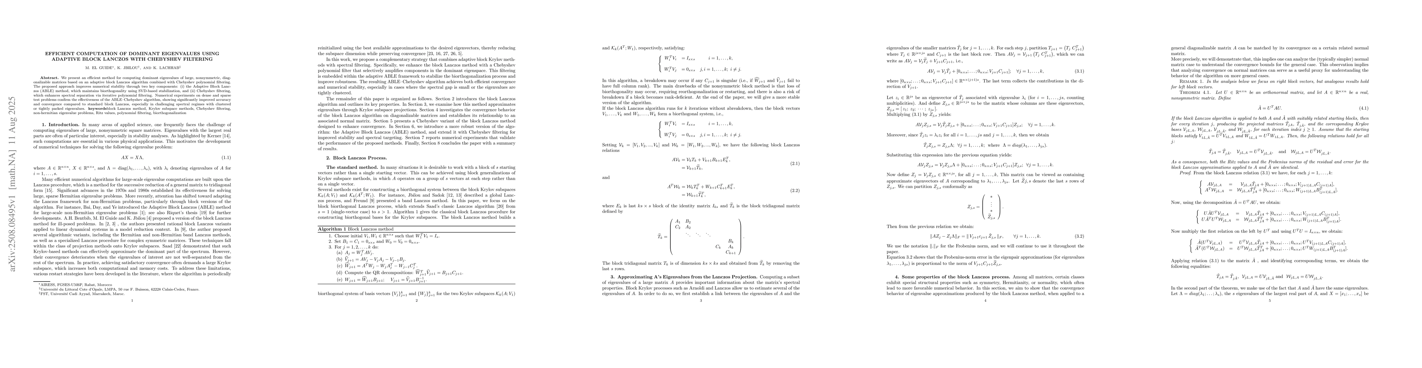 We present an efficient method for computing dominant eigenvalues of large, nonsymmetric, diagonalizable matrices based on an adaptive block Lanczos algorithm combined with Chebyshev polynomial filtering. The proposed approach improves numerical stability through two key components: (i) the Adaptive Block Lanczos (ABLE) method, which maintains biorthogonality using SVD based stabilization, and (ii) Chebyshev filtering, which enhances spectral separation via iterative polynomial filtering. Numerical experiments on dense and sparse test problems confirm the effectiveness of the ABLE Chebyshev algorithm.
