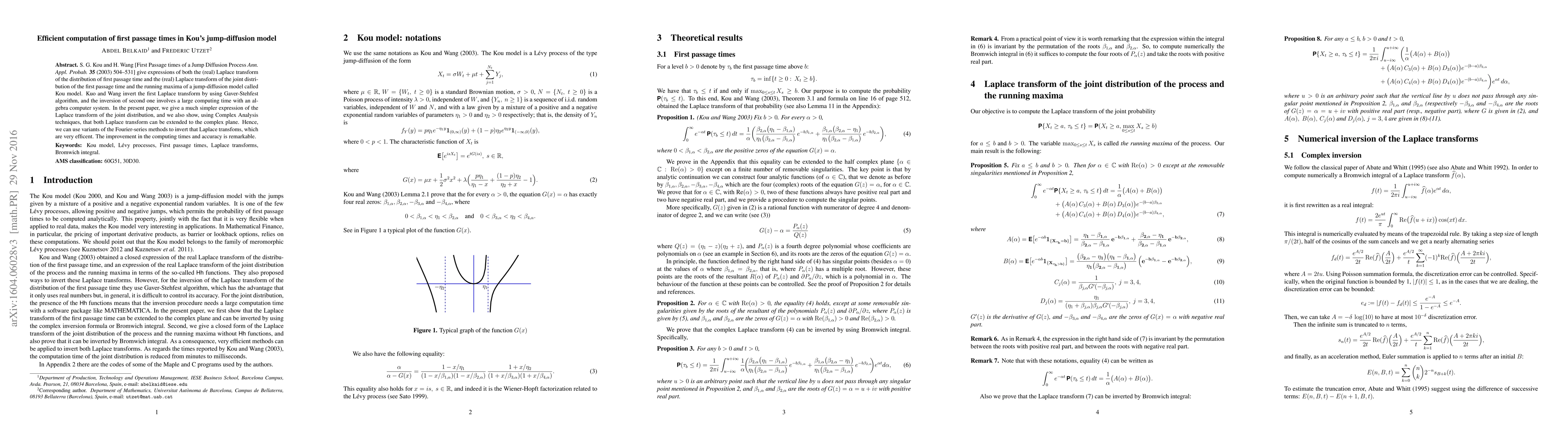 S. G. Kou and H. Wang [First Passage times of a Jump Diffusion Process \textit{Ann. Appl. Probab.} {\bf 35} (2003) 504--531] give expressions of both the (real) Laplace transform of the distribution of first passage time and the (real) Laplace transform of the joint distribution of the first passage time and the running maxima of a jump-diffusion model called Kou model. %However, to invert the last Laplace transform it is needed Kuo and Wang invert the first Laplace transform by using Gaver-Stehfest algorithm, and the inversion of second one involves a large computing time with an algebra computer system. In the present paper, we give a much simpler expression of the Laplace transform of the joint distribution, and we also show, using Complex Analysis techniques, that both Laplace transform can be extended to the complex plane. Hence, we can use variants of the Fourier-series methods to invert that Laplace transfoms, which are very efficent. The improvement in the computing times and accuracy is remarkable.