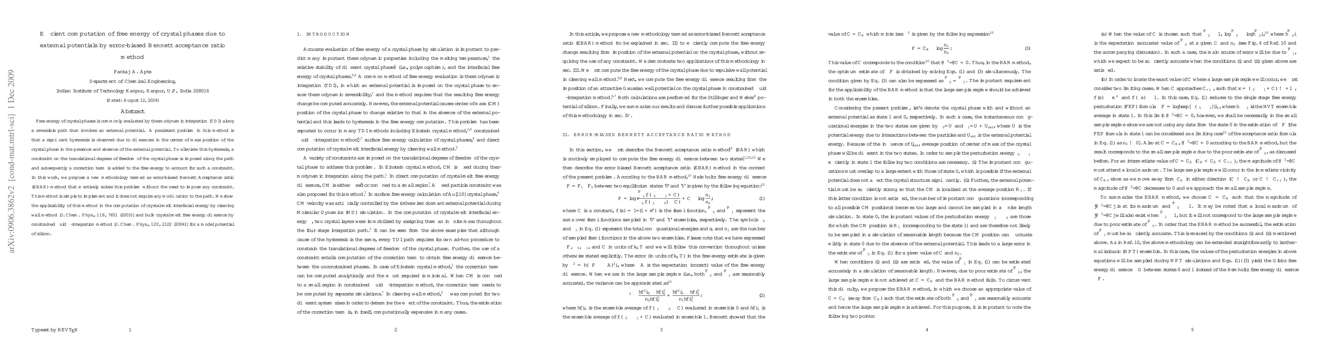 Free energy of crystal phases is commonly evaluated by thermodynamic integration (TDI) along a reversible path that involves an external potential. A persistent problem in this method is that a significant hysteresis is observed due to differences in the center of mass position of the crystal phase in the presence and absence of the external potential. To alleviate this hysteresis, a constraint on the translational degrees of freedom of the crystal phase is imposed along the path and subsequently a correction term is added to the free energy to account for such a constraint. In this work, we propose a new methodology termed as error-biased Bennett Acceptance ratio (EBAR) method that effectively solves this problem without the need to impose any constraint. This method is simple to implement as it does not require any modification to the path or to the simulation code. We show the applicability of this method in the computation of crystal-melt interfacial energy by cleaving wall method [J. Chem. Phys., 118, 7651 (2003)] and bulk crystal-melt free energy difference by constrained fluid $\lambda$-integration method [J. Chem. Phys., 120, 2122 (2004)] for a model potential of silicon.