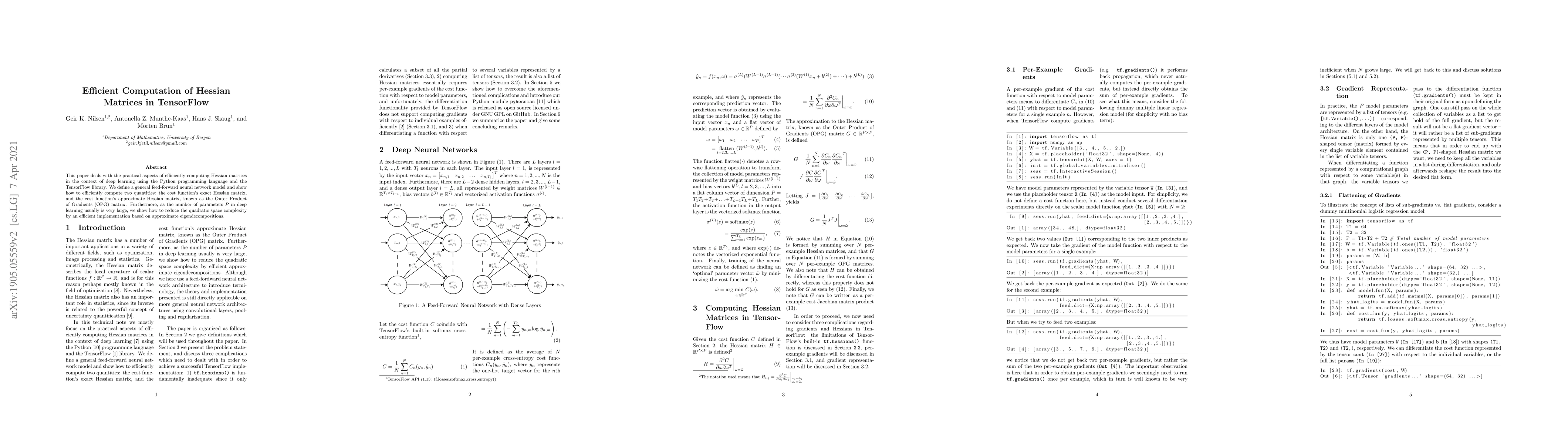 This paper presents methods for efficiently computing Hessian matrices in TensorFlow for deep learning applications, focusing on both exact and approximate Hessians. It also introduces techniques to reduce space complexity through approximate eigendecompositions, crucial for handling large neural network parameters.