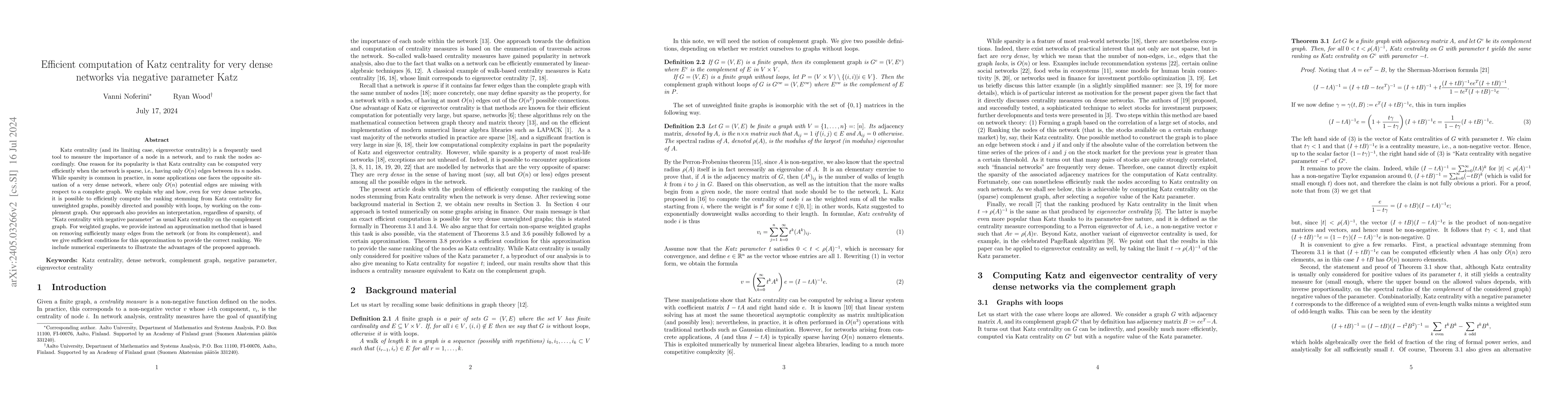 This paper proposes an efficient method for computing Katz centrality in very dense networks by leveraging the complement graph and introducing a "negative parameter Katz" approach. For unweighted dense graphs, the method works directly on the complement, while for weighted graphs, it provides an approximation by selectively removing edges, ensuring correct rankings under certain conditions.