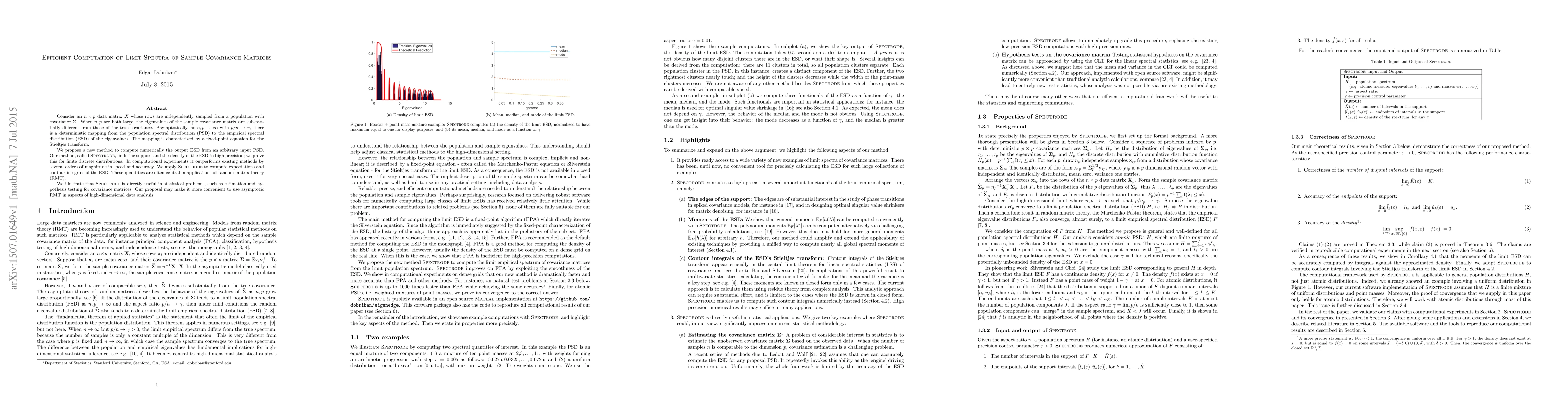 Consider an $n \times p$ data matrix $X$ whose rows are independently sampled from a population with covariance $\Sigma$. When $n,p$ are both large, the eigenvalues of the sample covariance matrix are substantially different from those of the true covariance. Asymptotically, as $n,p \to \infty$ with $p/n \to \gamma$, there is a deterministic mapping from the population spectral distribution (PSD) to the empirical spectral distribution (ESD) of the eigenvalues. The mapping is characterized by a fixed-point equation for the Stieltjes transform. We propose a new method to compute numerically the output ESD from an arbitrary input PSD. Our method, called Spectrode, finds the support and the density of the ESD to high precision; we prove this for finite discrete distributions. In computational experiments it outperforms existing methods by several orders of magnitude in speed and accuracy. We apply Spectrode to compute expectations and contour integrals of the ESD. These quantities are often central in applications of random matrix theory (RMT). We illustrate that Spectrode is directly useful in statistical problems, such as estimation and hypothesis testing for covariance matrices. Our proposal may make it more convenient to use asymptotic RMT in aspects of high-dimensional data analysis.