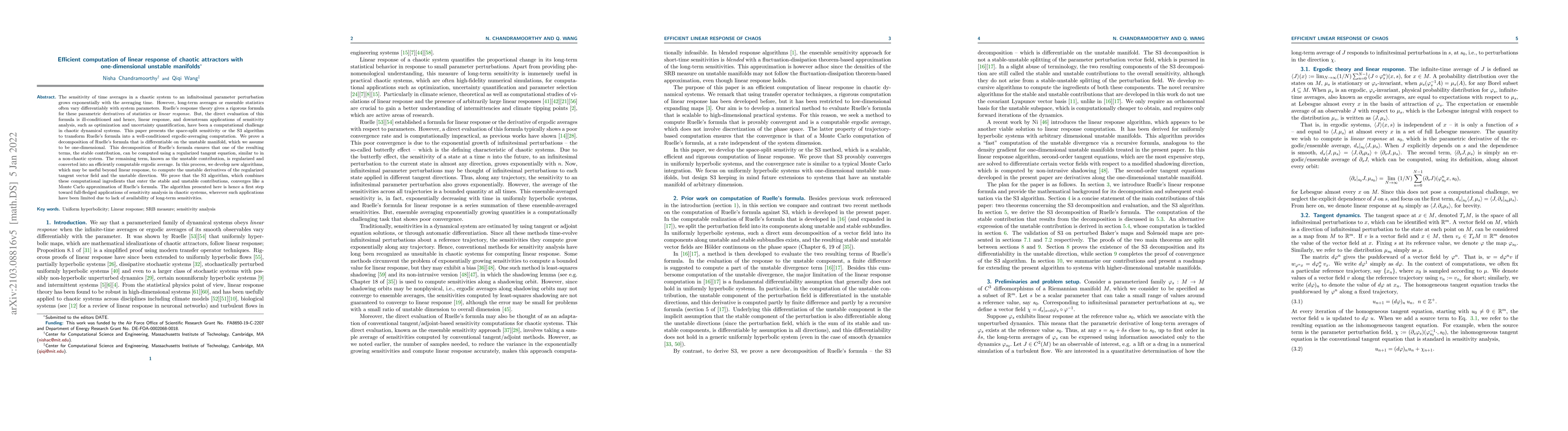 This paper introduces the S3 algorithm for efficiently computing the linear response of chaotic attractors with one-dimensional unstable manifolds, transforming Ruelle's formula into a well-conditioned ergodic average. The algorithm decomposes Ruelle's formula into stable and unstable contributions, enabling efficient computation and the development of new algorithms for statistical quantities and derivatives.