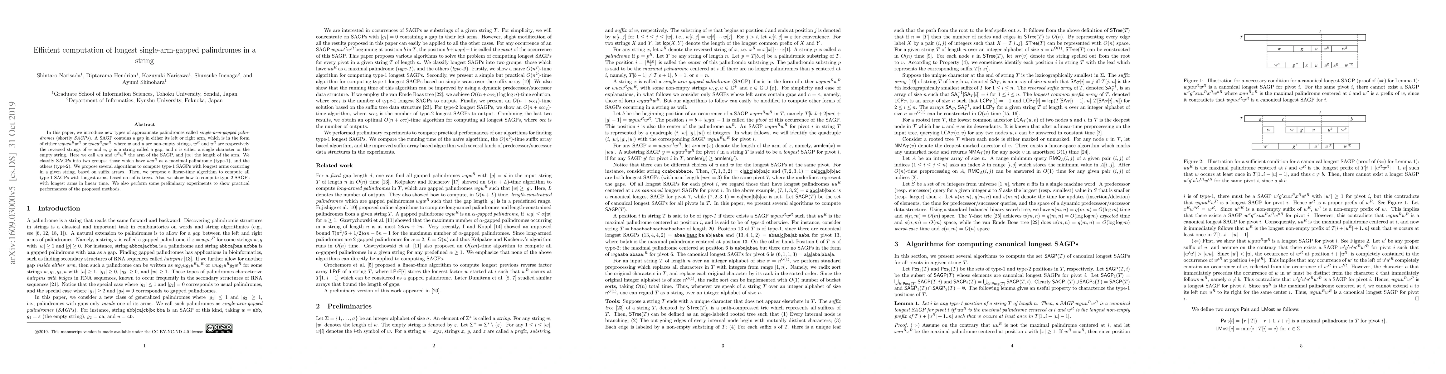 In this paper, we introduce new types of approximate palindromes called single-arm-gapped palindromes (shortly SAGPs). A SAGP contains a gap in either its left or right arm, which is in the form of either $wguc u^R w^R$ or $wuc u^Rgw^R$, where $w$ and $u$ are non-empty strings, $w^R$ and $u^R$ are respectively the reversed strings of $w$ and $u$, $g$ is a string called a gap, and $c$ is either a single character or the empty string. Here we call $wu$ and $u^R w^R$ the arm of the SAGP, and $|uv|$ the length of the arm. We classify SAGPs into two groups: those which have $ucu^R$ as a maximal palindrome (type-1), and the others (type-2). We propose several algorithms to compute type-1 SAGPs with longest arms occurring in a given string, based on suffix arrays. Then, we propose a linear-time algorithm to compute all type-1 SAGPs with longest arms, based on suffix trees. Also, we show how to compute type-2 SAGPs with longest arms in linear time. We also perform some preliminary experiments to show practical performances of the proposed methods.