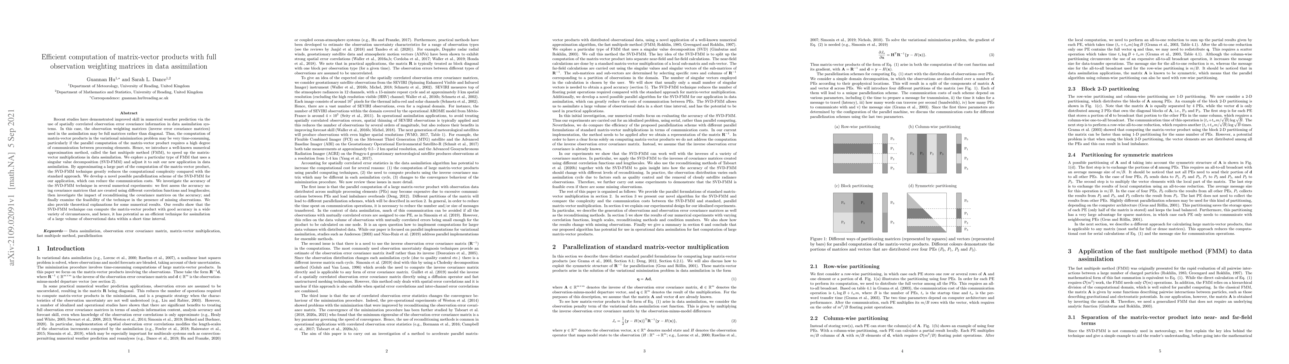 This paper introduces the fast multipole method (FMM) with a singular value decomposition (SVD-FMM) to efficiently compute matrix-vector products in data assimilation systems using full observation weighting matrices. The proposed parallelization scheme reduces communication costs and computational complexity, demonstrating potential for handling large observational datasets quickly.
