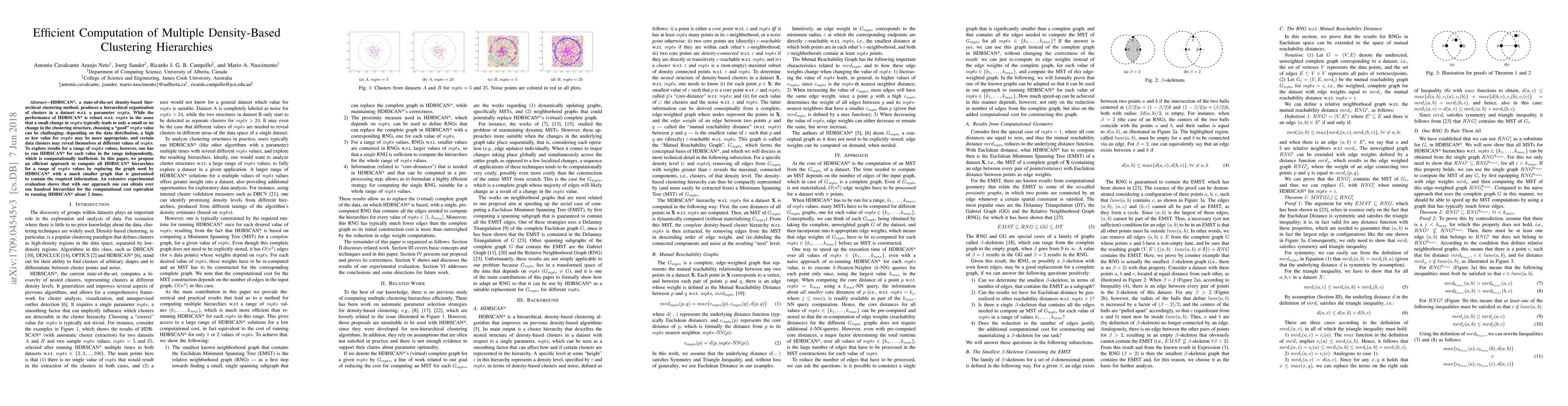 A new approach allows efficient computation of multiple density-based clustering hierarchies by replacing HDBSCAN* graph with a smaller equivalent graph, reducing computational cost to run about 2 times the original HDBSCAN*.