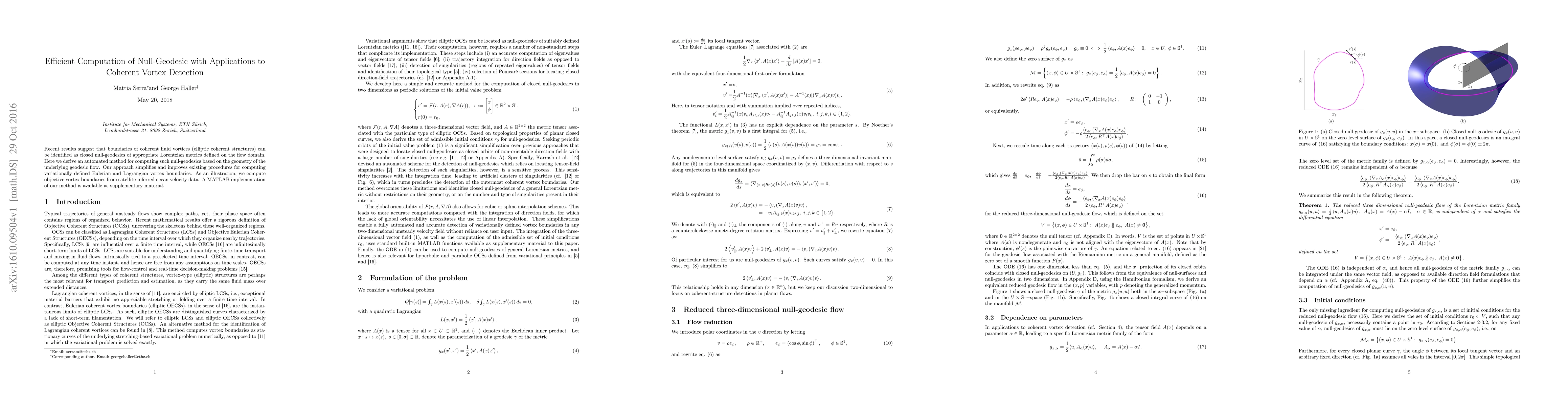 Recent results suggest that boundaries of coherent fluid vortices (elliptic coherent structures) can be identified as closed null-geodesics of appropriate Lorentzian metrics defined on the flow domain. Here we derive an automated method for computing such null-geodesics based on the geometry of the underlying geodesic flow. Our approach simplifies and improves existing procedures for computing variationally defined Eulerian and Lagrangian vortex boundaries. As an illustration, we compute objective vortex boundaries from satellite-inferred ocean velocity data. A MATLAB implementation of our method is available as supplementary material.