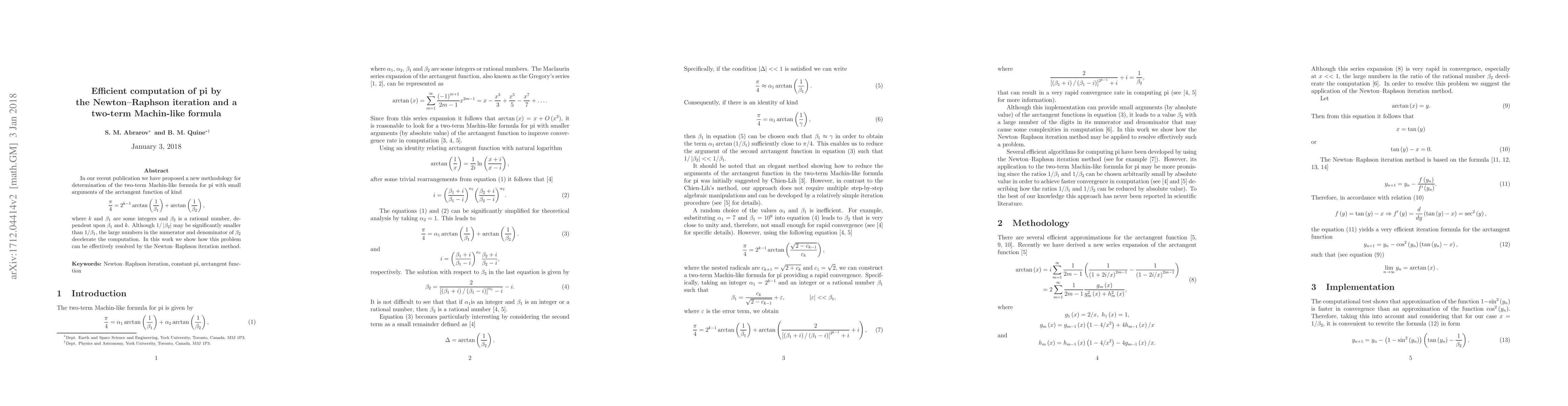 In our recent publication we have proposed a new methodology for determination of the two-term Machin-like formula for pi with small arguments of the arctangent function of kind $$ \frac{\pi }{4} = {2^{k - 1}}\arctan \left( {\frac{1}{{{\beta_1}}}} \right) + \arctan \left( {\frac{1}{{{\beta_2}}}} \right), $$ where $k$ and ${\beta_1}$ are some integers and ${\beta_2}$ is a rational number, dependent upon ${\beta_1}$ and $k$. Although ${1/\left|\beta_2\right|}$ may be significantly smaller than ${1/\beta_1}$, the large numbers in the numerator and denominator of $\beta_2$ decelerate the computation. In this work we show how this problem can be effectively resolved by the Newton--Raphson iteration method.