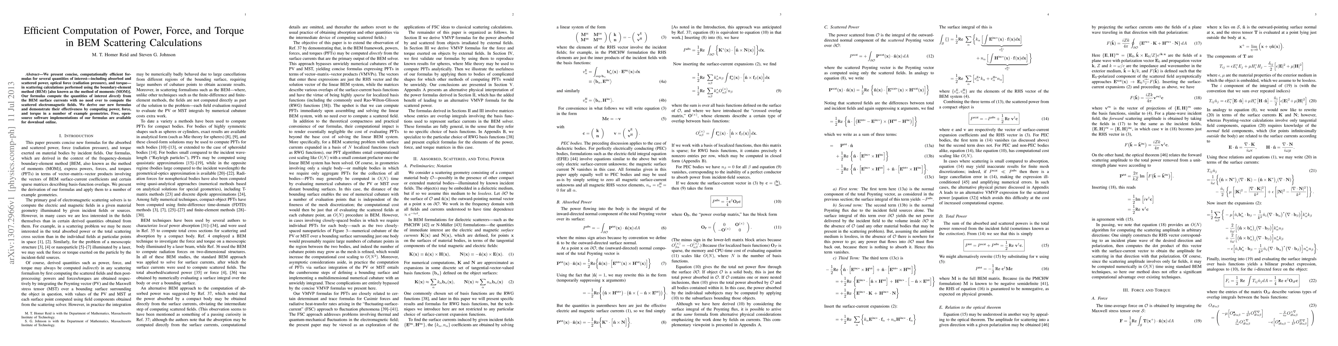 We present concise, computationally efficient formulas for several quantities of interest -- including absorbed and scattered power, optical force (radiation pressure), and torque -- in scattering calculations performed using the boundary-element method (BEM) [also known as the method of moments (MOM)]. Our formulas compute the quantities of interest \textit{directly} from the BEM surface currents with no need ever to compute the scattered electromagnetic fields. We derive our new formulas and demonstrate their effectiveness by computing power, force, and torque in a number of example geometries. Free, open-source software implementations of our formulas are available for download online.