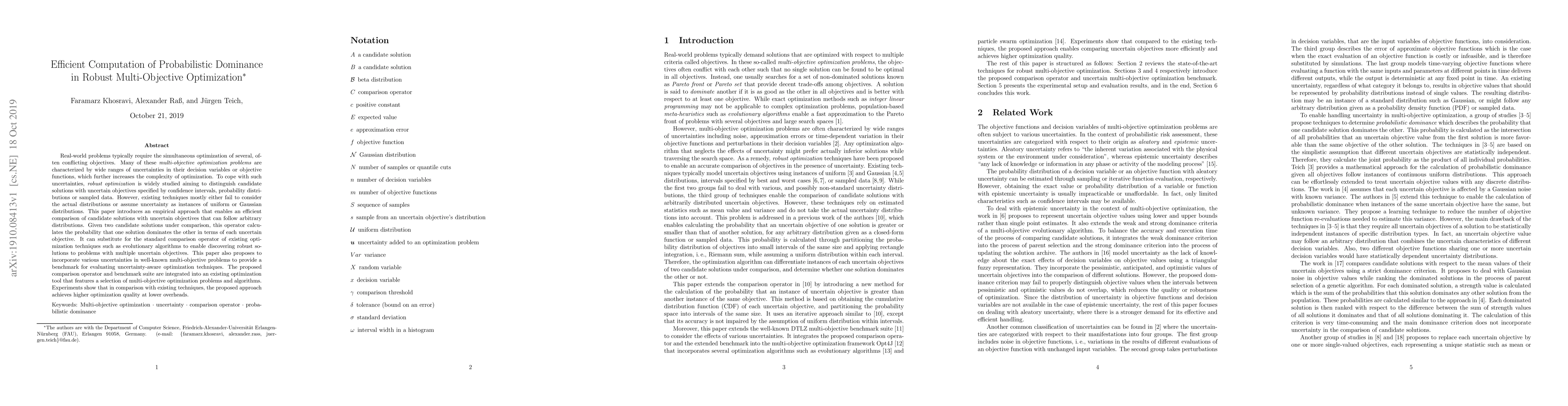 This paper introduces an efficient method for probabilistic dominance comparison in robust multi-objective optimization, addressing uncertainties in decision variables and objective functions. It proposes an empirical operator to calculate the probability of one solution dominating another under arbitrary distribution uncertainties, enhancing optimization quality with lower computational overhead.