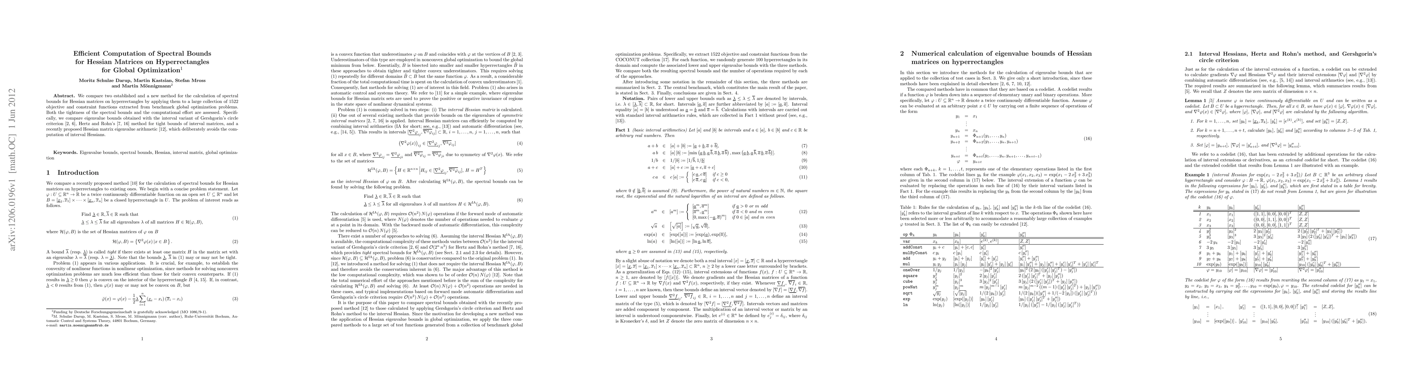 This paper compares three methods for computing spectral bounds of Hessian matrices on hyperrectangles, evaluating their tightness and computational efficiency using 1522 benchmark global optimization functions. The methods assessed include Gershgorin's circle criterion, Hertz and Rohn's interval matrix approach, and a novel Hessian matrix eigenvalue arithmetic technique.