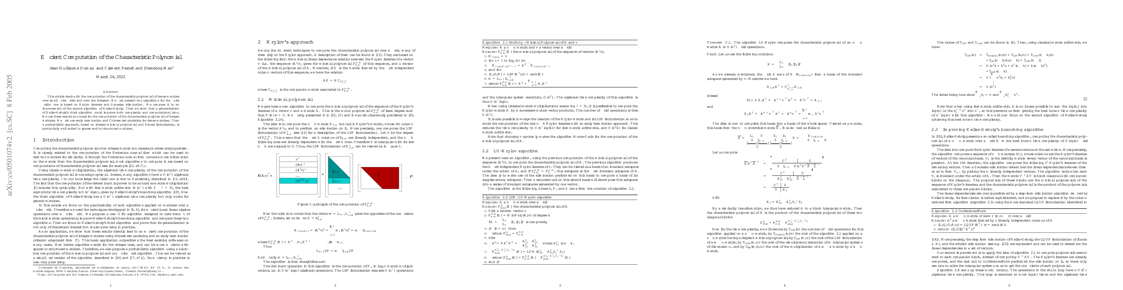 The paper presents two algorithms for computing the characteristic polynomial of dense matrices over finite fields and integers, improving upon existing methods in complexity and computational time.
