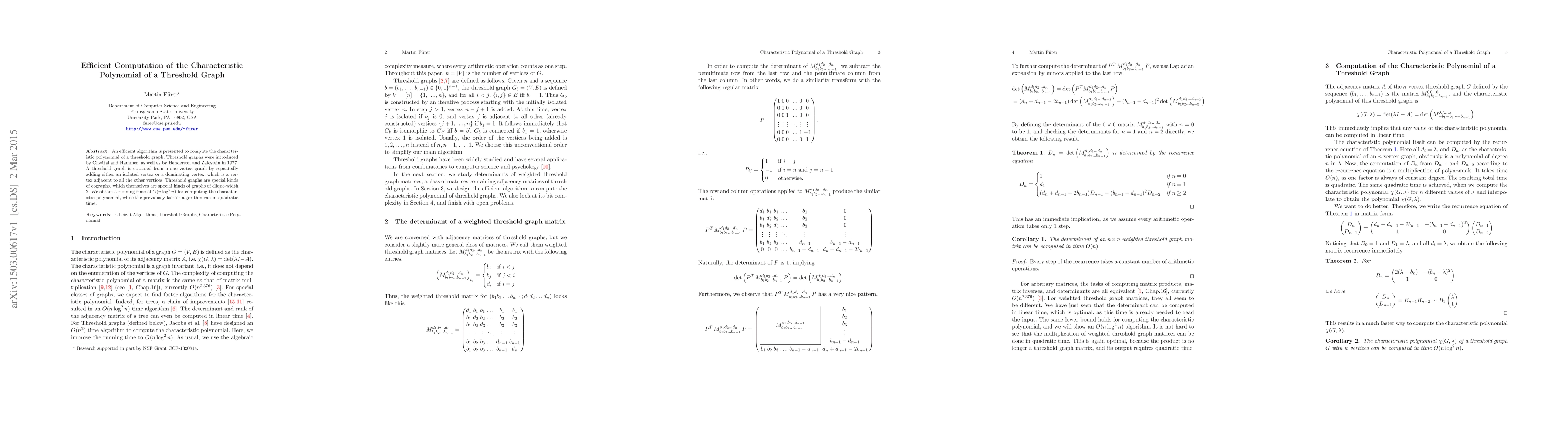 This paper presents an efficient algorithm to compute the characteristic polynomial of threshold graphs in $O(n \log^2 n)$ time, significantly improving upon the previous quadratic time method. Threshold graphs are a specific type of cograph characterized by simple construction rules.