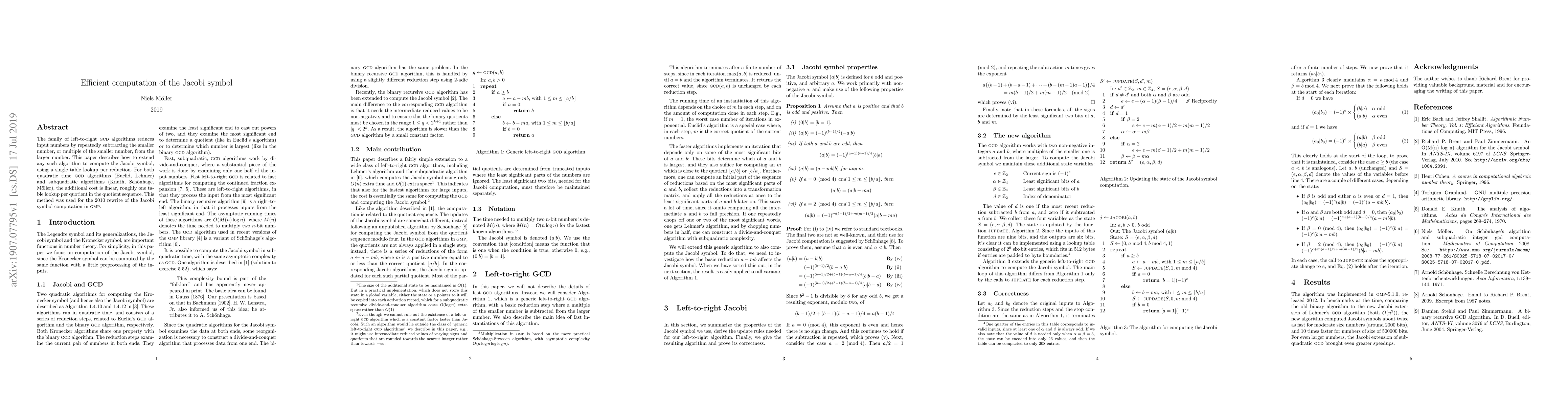 This paper introduces a method to efficiently compute the Jacobi symbol using left-to-right GCD algorithms with a single table lookup per reduction, adding minimal computational cost.