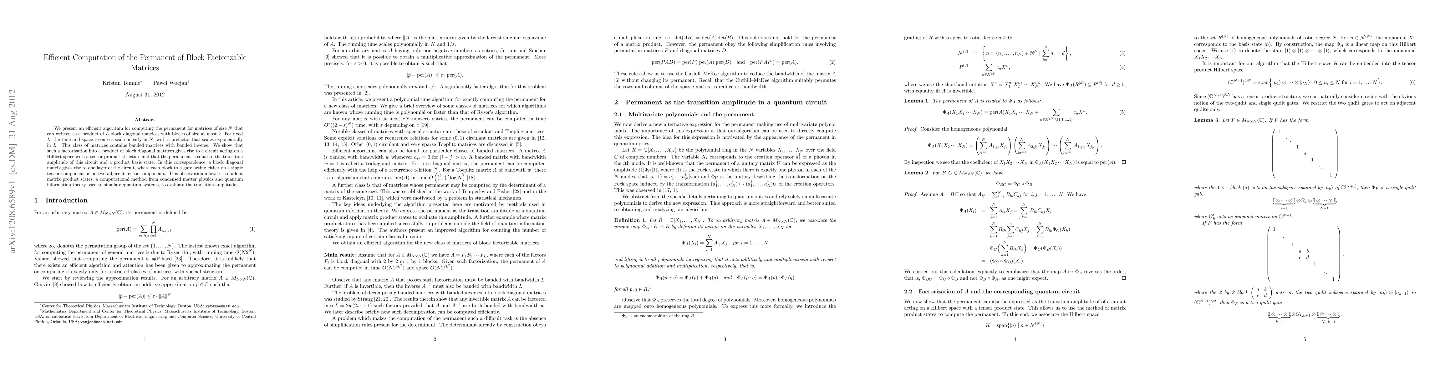 We present an efficient algorithm for computing the permanent for matrices of size N that can written as a product of L block diagonal matrices with blocks of size at most 2. For fixed L, the time and space resources scale linearly in N, with a prefactor that scales exponentially in L. This class of matrices contains banded matrices with banded inverse. We show that such a factorization into a product of block diagonal matrices gives rise to a circuit acting on a Hilbert space with a tensor product structure and that the permanent is equal to the transition amplitude of this circuit and a product basis state. In this correspondence, a block diagonal matrix gives rise to one layer of the circuit, where each block to a gate acting either on a single tensor component or on two adjacent tensor components. This observation allows us to adopt matrix product states, a computational method from condensed matter physics and quantum information theory used to simulate quantum systems, to evaluate the transition amplitude.