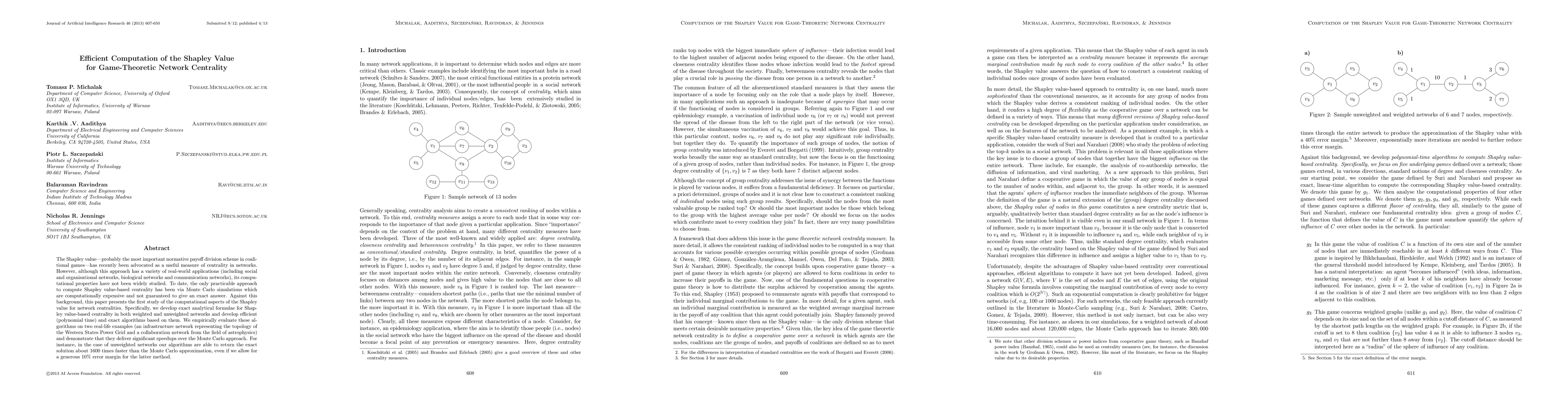 This paper develops efficient algorithms for computing Shapley value-based centrality in networks, providing exact analytical formulae and polynomial time solutions that outperform Monte Carlo simulations, achieving up to 1600 times faster computation times in unweighted networks.