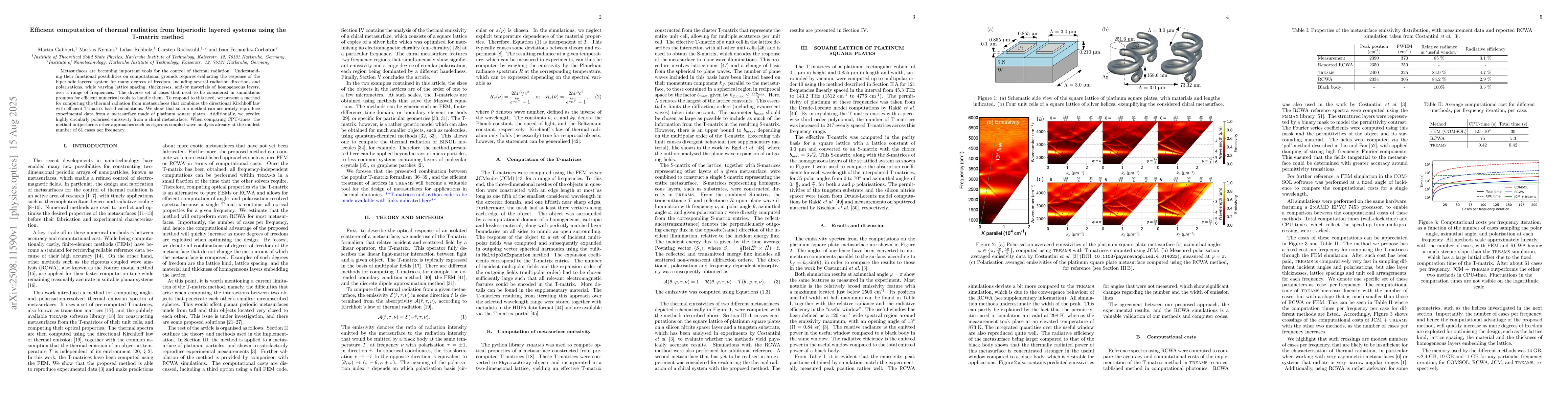 Metasurfaces are becoming important tools for the control of thermal radiation. Understanding their functional possibilities on computational grounds requires evaluating the response of the biperiodic layered system for many degrees of freedom, including several radiation directions and polarisations, while varying lattice spacing, thicknesses, and/or materials of homogeneous layers, over a range of frequencies. The diverse set of cases that need to be considered in simulations prompts for efficient numerical tools to handle them. To respond to this need, we present a method for computing the thermal radiation from metasurfaces that combines the directional Kirchhoff law with efficient T-matrix based calculations. We show that such a method can accurately reproduce experimental data from a metasurface made of platinum square plates. Additionally, we predict highly circularly polarised emissivity from a chiral metasurface. When comparing CPU-times, the method outperforms other approaches such as rigorous coupled wave analysis already at the modest number of 61 cases per frequency.