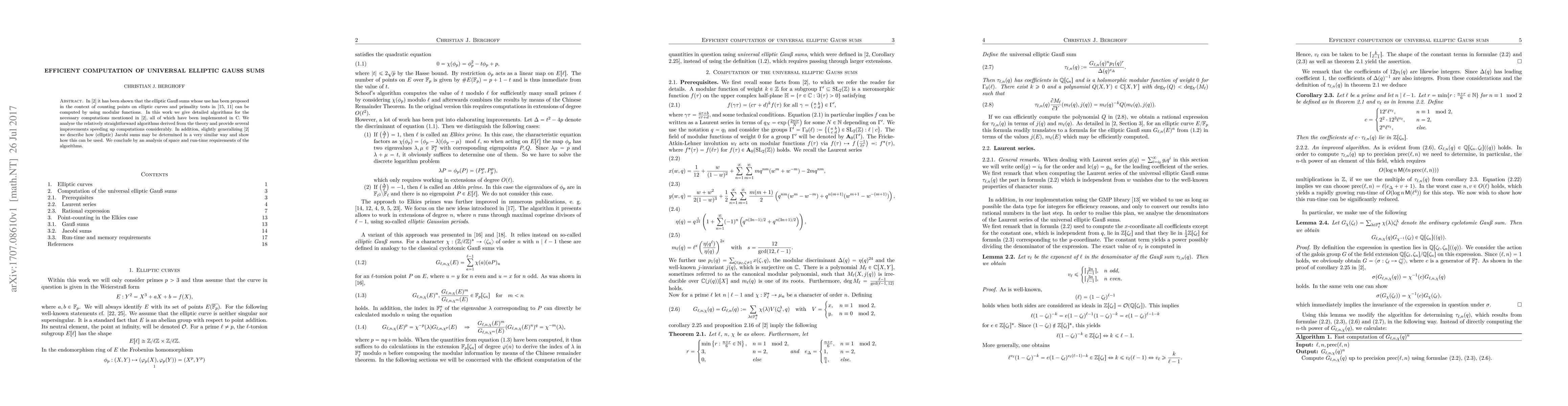 This paper presents efficient algorithms for computing universal elliptic Gauss sums, utilizing modular functions and implemented in C. It introduces improvements that significantly speed up computations and extends the method to elliptic Jacobi sums, analyzing the space and run-time requirements of the proposed algorithms.
