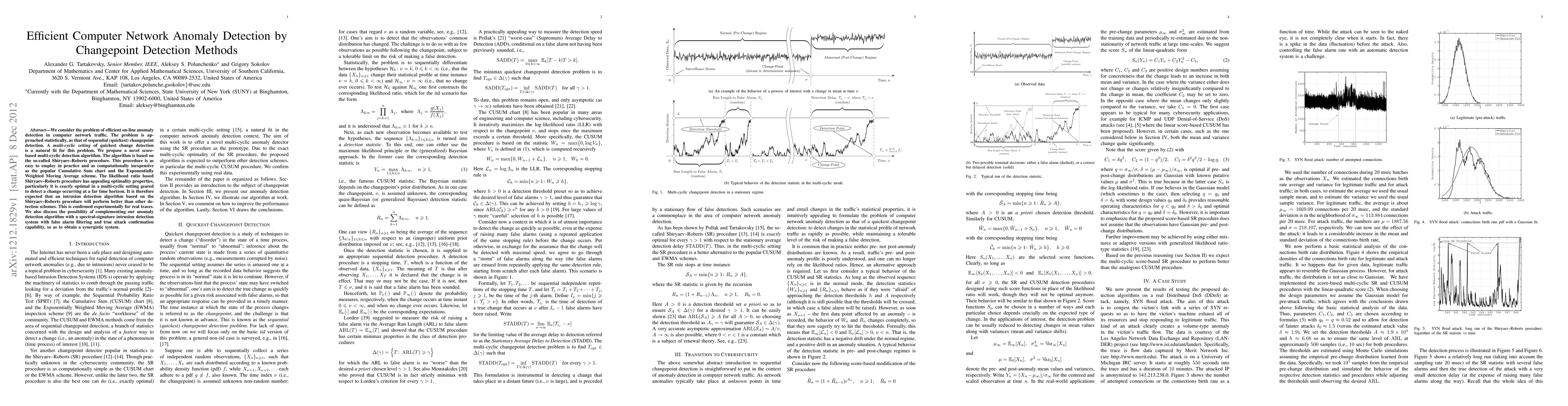 This paper proposes a novel score-based multi-cyclic detection algorithm for efficient on-line anomaly detection in computer network traffic, employing the Shiryaev-Roberts procedure for optimal performance. Experimental results confirm its superior performance compared to other schemes, and it is suggested to synergize with a spectral-signature intrusion detection system for enhanced detection.