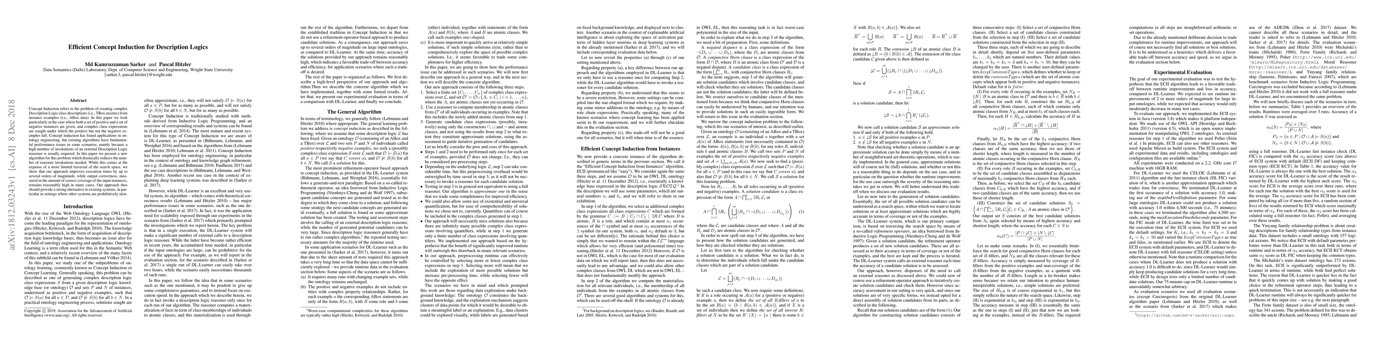 Concept Induction refers to the problem of creating complex Description Logic class descriptions (i.e., TBox axioms) from instance examples (i.e., ABox data). In this paper we look particularly at the case where both a set of positive and a set of negative instances are given, and complex class expressions are sought under which the positive but not the negative examples fall. Concept induction has found applications in ontology engineering, but existing algorithms have fundamental performance issues in some scenarios, mainly because a high number of invokations of an external Description Logic reasoner is usually required. In this paper we present a new algorithm for this problem which drastically reduces the number of reasoner invokations needed. While this comes at the expense of a more limited traversal of the search space, we show that our approach improves execution times by up to several orders of magnitude, while output correctness, measured in the amount of correct coverage of the input instances, remains reasonably high in many cases. Our approach thus should provide a strong alternative to existing systems, in particular in settings where other systems are prohibitively slow.