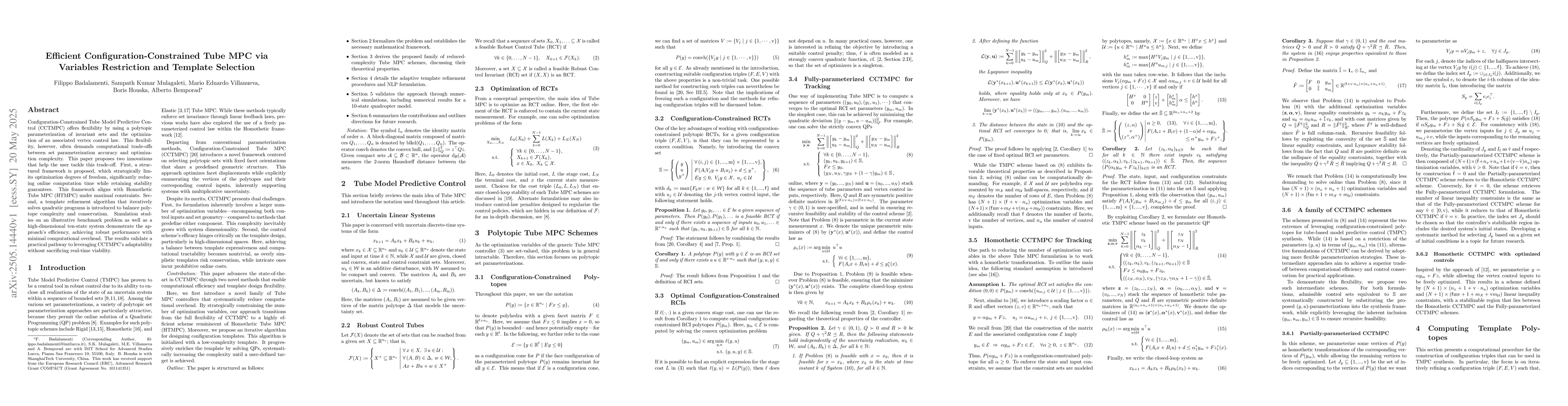The paper proposes a structured framework that limits optimization degrees of freedom and a template refinement algorithm for balancing polytope complexity and conservatism in Configuration-Constrained Tube MPC (CCTMPC).