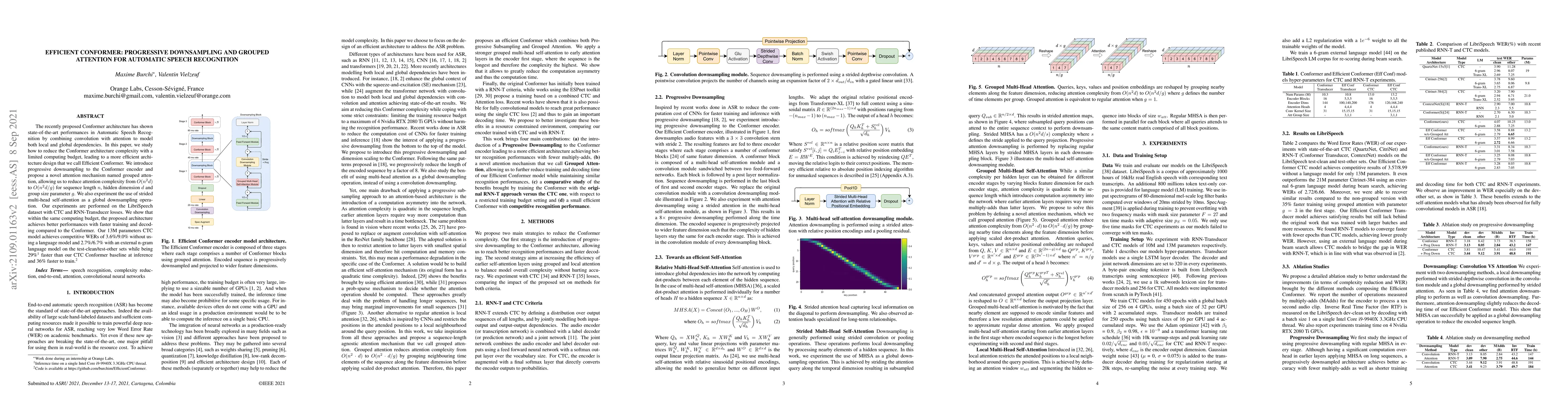 This paper proposes an Efficient Conformer architecture for Automatic Speech Recognition, utilizing progressive downsampling and grouped attention to reduce complexity while maintaining performance. Experiments on LibriSpeech show competitive word error rates and faster training and inference compared to the standard Conformer model.