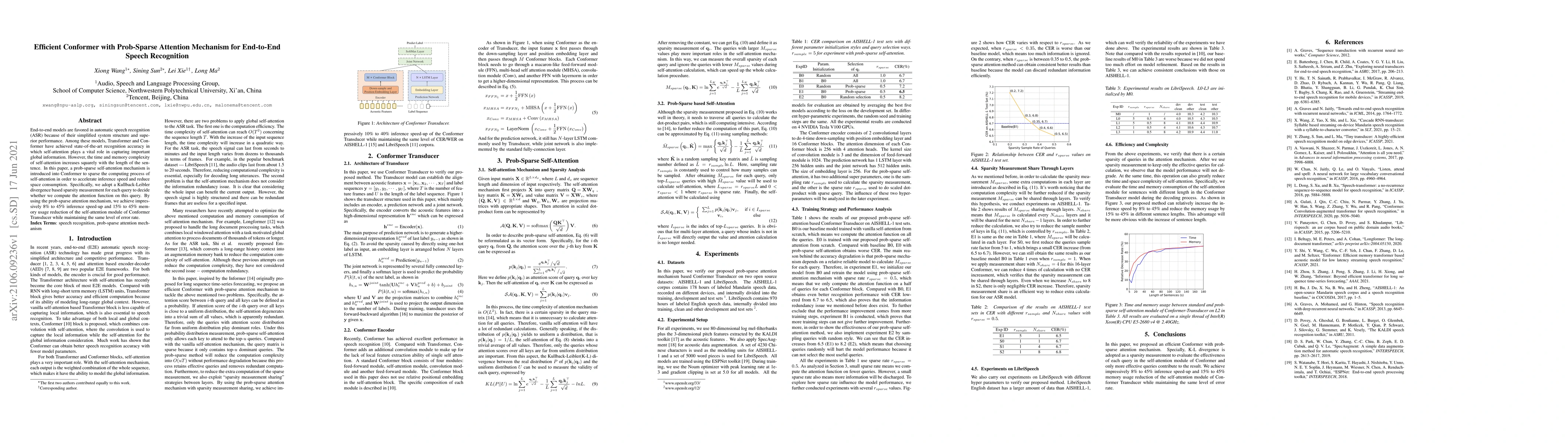 This paper proposes a prob-sparse attention mechanism integrated into the Conformer model to enhance end-to-end speech recognition, achieving significant speed and memory improvements while maintaining accuracy. The method employs a Kullback-Leibler divergence-based sparsity measurement to selectively compute attention, resulting in notable reductions in inference time and memory usage.