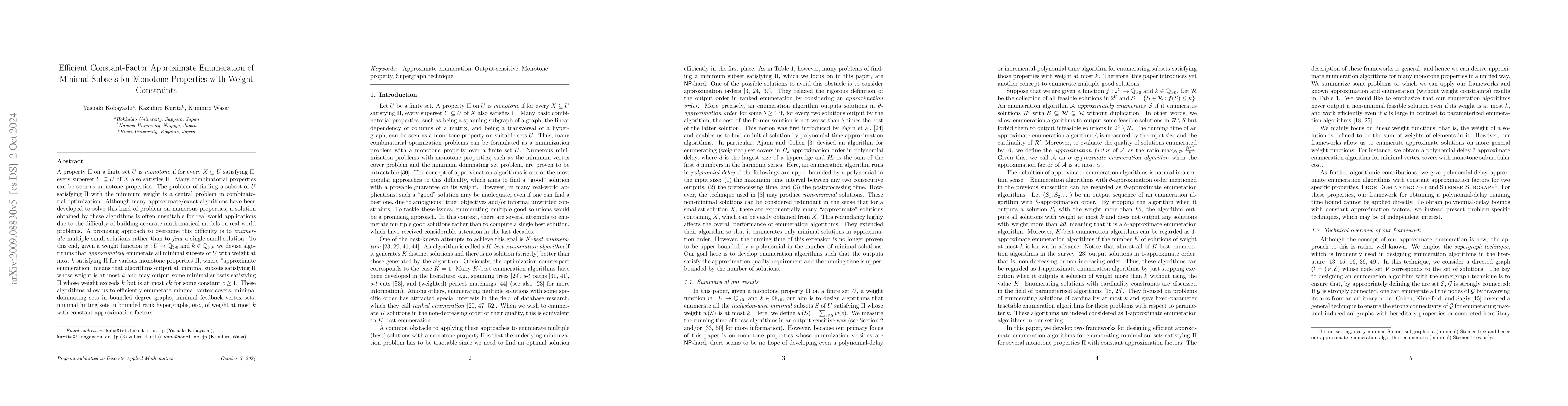 This paper presents efficient algorithms for approximately enumerating minimal subsets of a finite set that satisfy a given monotone property and have a weight constraint. The algorithms provide constant-factor approximations and can enumerate solutions for various combinatorial optimization problems, such as minimal vertex covers and dominating sets, under bounded conditions.