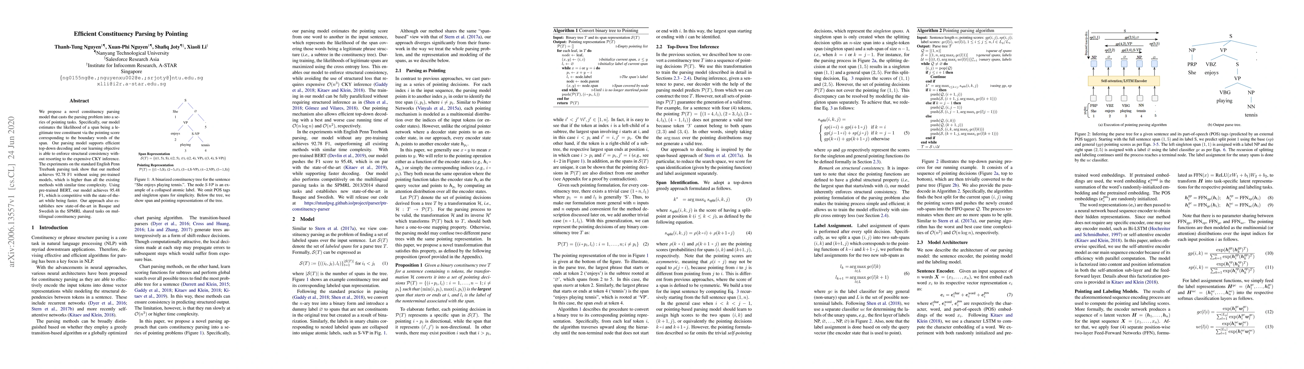 This paper introduces an efficient constituency parsing model that leverages pointing tasks to determine tree constituents, achieving competitive F1 scores on English, Basque, and Swedish parsing tasks without relying on pre-trained models. When combined with BERT, it reaches state-of-the-art performance while maintaining faster decoding speeds.