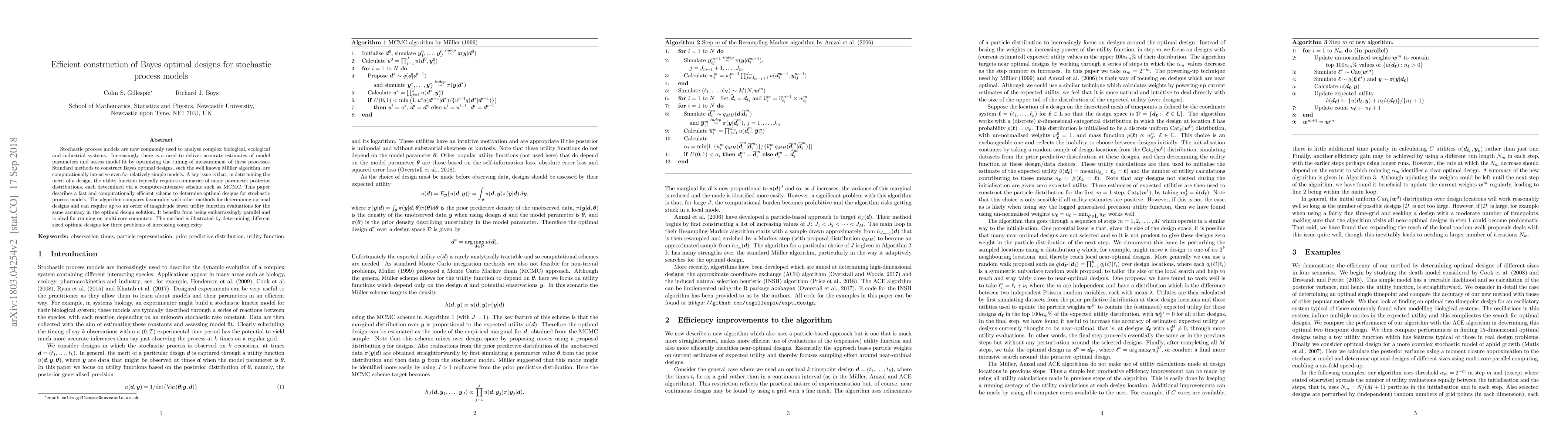 Stochastic process models are now commonly used to analyse complex biological, ecological and industrial systems. Increasingly there is a need to deliver accurate estimates of model parameters and assess model fit by optimizing the timing of measurement of these processes. Standard methods to construct Bayes optimal designs, such as the well known \Muller algorithm, are computationally intensive even for relatively simple models. A key issue is that, in determining the merit of a design, the utility function typically requires summaries of many parameter posterior distributions, each determined via a computer-intensive scheme such as MCMC. This paper describes a fast and computationally efficient scheme to determine optimal designs for stochastic process models. The algorithm compares favourably with other methods for determining optimal designs and can require up to an order of magnitude fewer utility function evaluations for the same accuracy in the optimal design solution. It benefits from being embarrassingly parallel and is ideal for running on multi-core computers. The method is illustrated by determining different sized optimal designs for three problems of increasing complexity.