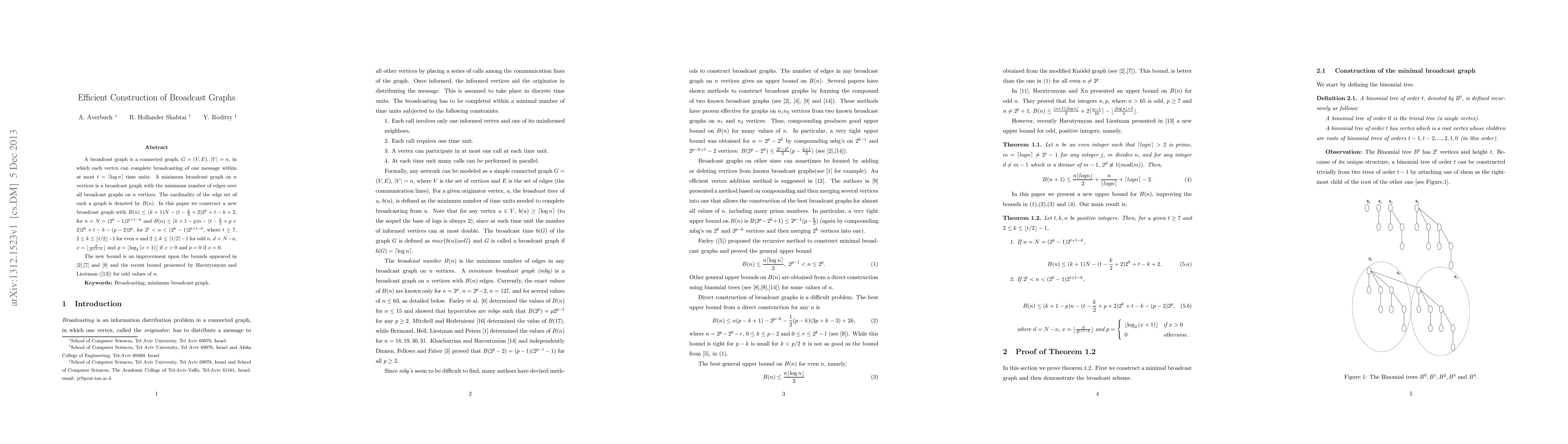 A new efficient construction of broadcast graphs is presented with improved bounds for even and odd values of n, achieving a better result than the existing Harutyunyan and Liestman bound.