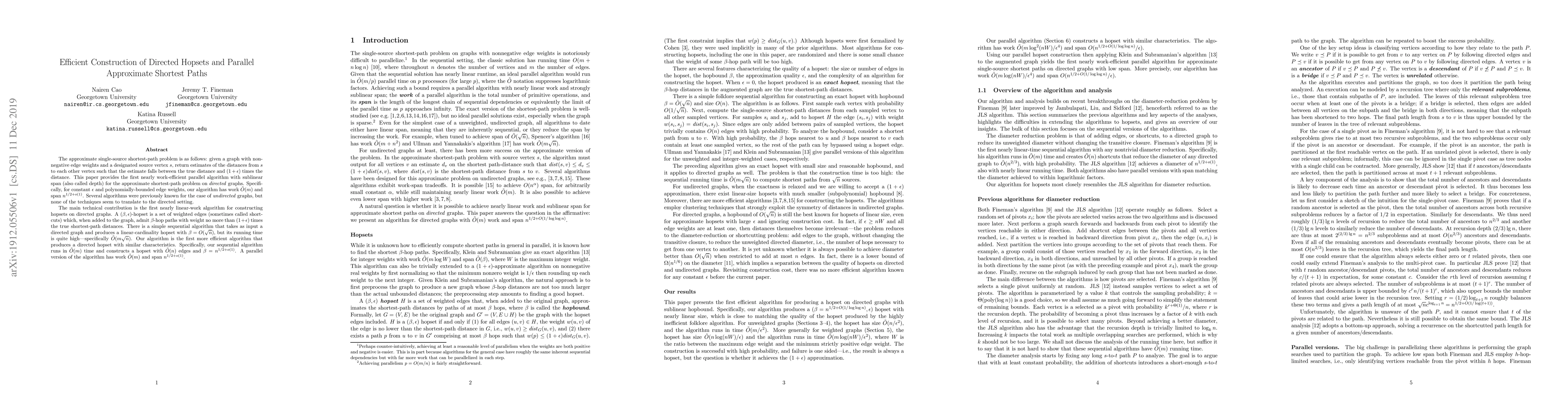 The approximate single-source shortest-path problem is as follows: given a graph with nonnegative edge weights and a designated source vertex $s$, return estimates of the distances from~$s$ to each other vertex such that the estimate falls between the true distance and $(1+\epsilon)$ times the distance. This paper provides the first nearly work-efficient parallel algorithm with sublinear span (also called depth) for the approximate shortest-path problem on \emph{directed} graphs. Specifically, for constant $\epsilon$ and polynomially-bounded edge weights, our algorithm has work $\tilde{O}(m)$ and span $n^{1/2+o(1)}$. Several algorithms were previously known for the case of \emph{undirected} graphs, but none of the techniques seem to translate to the directed setting. The main technical contribution is the first nearly linear-work algorithm for constructing hopsets on directed graphs. A $(\beta,\epsilon)$-hopset is a set of weighted edges (sometimes called shortcuts) which, when added to the graph, admit $\beta$-hop paths with weight no more than $(1+\epsilon)$ times the true shortest-path distances. There is a simple sequential algorithm that takes as input a directed graph and produces a linear-cardinality hopset with $\beta=O(\sqrt{n})$, but its running time is quite high---specifically $\tilde{O}(m\sqrt{n})$. Our algorithm is the first more efficient algorithm that produces a directed hopset with similar characteristics. Specifically, our sequential algorithm runs in $\tilde{O}(m)$ time and constructs a hopset with $\tilde{O}(n)$ edges and $\beta = n^{1/2+o(1)}$. A parallel version of the algorithm has work $\tilde{O}(m)$ and span $n^{1/2+o(1)}$.