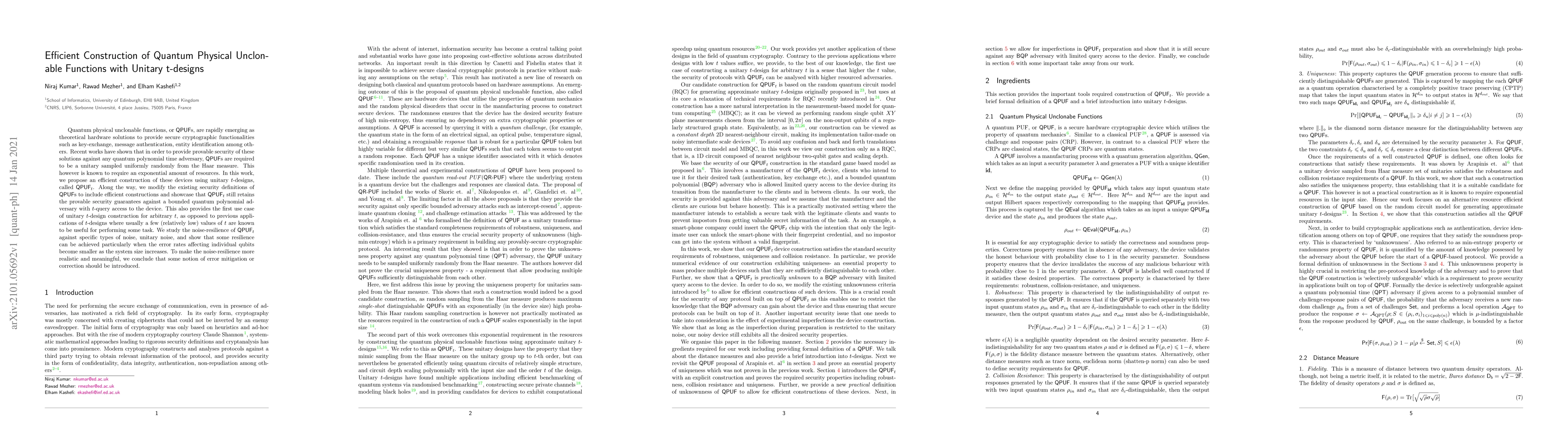 Quantum physical unclonable functions, or QPUFs, are rapidly emerging as theoretical hardware solutions to provide secure cryptographic functionalities such as key-exchange, message authentication, entity identification among others. Recent works have shown that in order to provide provable security of these solutions against any quantum polynomial time adversary, QPUFs are required to be a unitary sampled uniformly randomly from the Haar measure. This however is known to require an exponential amount of resources. In this work, we propose an efficient construction of these devices using unitary t-designs, called QPUF_t. Along the way, we modify the existing security definitions of QPUFs to include efficient constructions and showcase that QPUF_t still retains the provable security guarantees against a bounded quantum polynomial adversary with t-query access to the device. This also provides the first use case of unitary t-design construction for arbitrary t, as opposed to previous applications of t-designs where usually a few (relatively low) values of t are known to be useful for performing some task. We study the noise-resilience of QPUF_t against specific types of noise, unitary noise, and show that some resilience can be achieved particularly when the error rates affecting individual qubits become smaller as the system size increases. To make the noise-resilience more realistic and meaningful, we conclude that some notion of error mitigation or correction should be introduced.