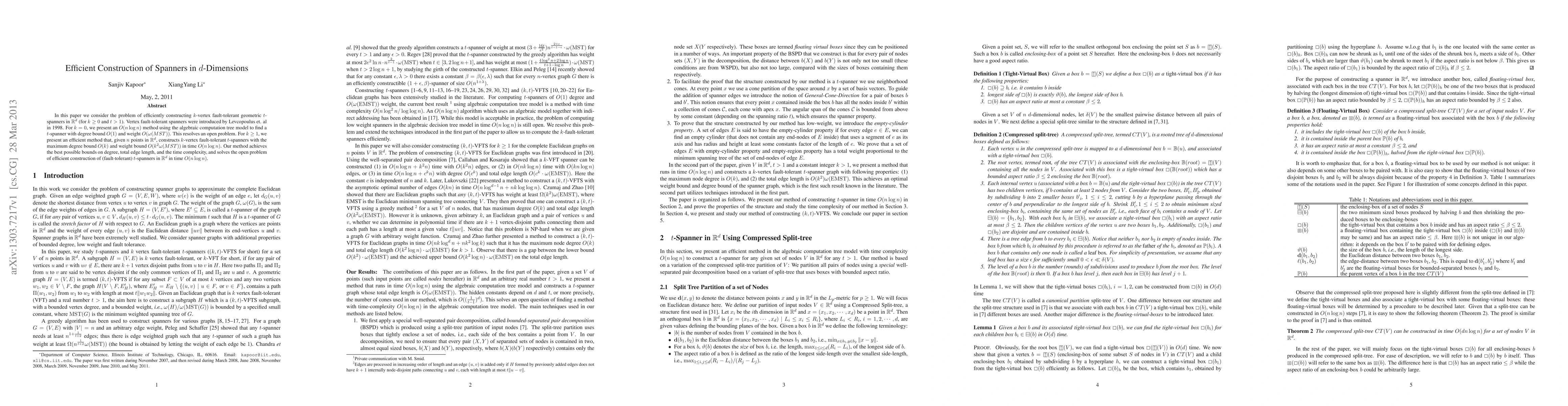 In this paper we consider the problem of efficiently constructing $k$-vertex fault-tolerant geometric $t$-spanners in $\dspace$ (for $k \ge 0$ and $t >1$). Vertex fault-tolerant spanners were introduced by Levcopoulus et. al in 1998. For $k=0$, we present an $O(n \log n)$ method using the algebraic computation tree model to find a $t$-spanner with degree bound O(1) and weight $O(\weight(MST))$. This resolves an open problem. For $k \ge 1$, we present an efficient method that, given $n$ points in $\dspace$, constructs $k$-vertex fault-tolerant $t$-spanners with the maximum degree bound O(k) and weight bound $O(k^2 \weight(MST))$ in time $O(n \log n)$. Our method achieves the best possible bounds on degree, total edge length, and the time complexity, and solves the open problem of efficient construction of (fault-tolerant) $t$-spanners in $\dspace$ in time $O(n \log n)$.