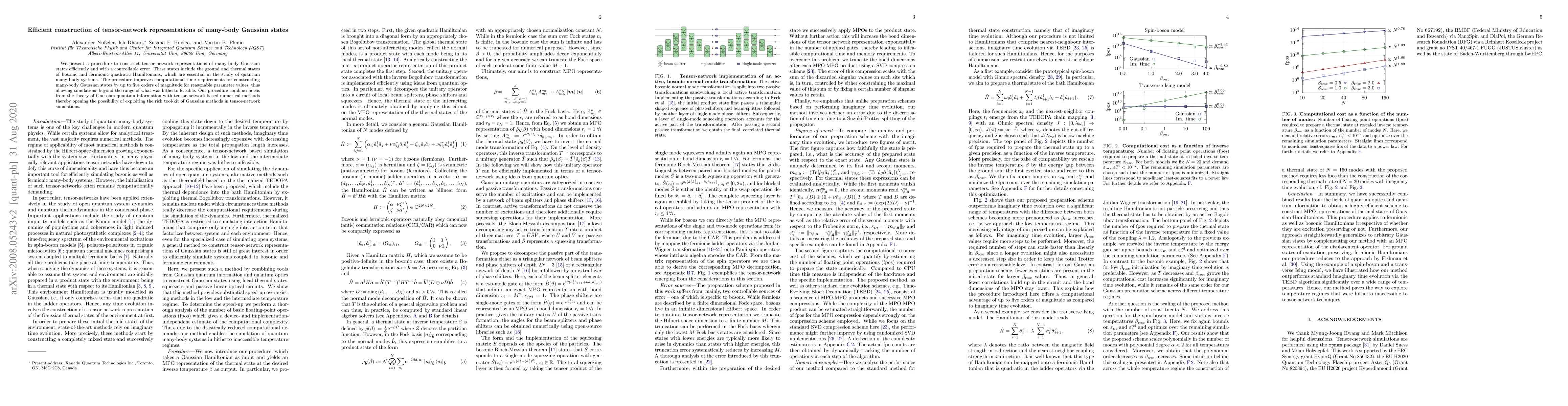 This paper introduces an efficient method for constructing tensor-network representations of many-body Gaussian states with controllable error, significantly reducing computational time by up to five orders of magnitude. This advancement enables simulations of quantum many-body systems beyond previous limits.