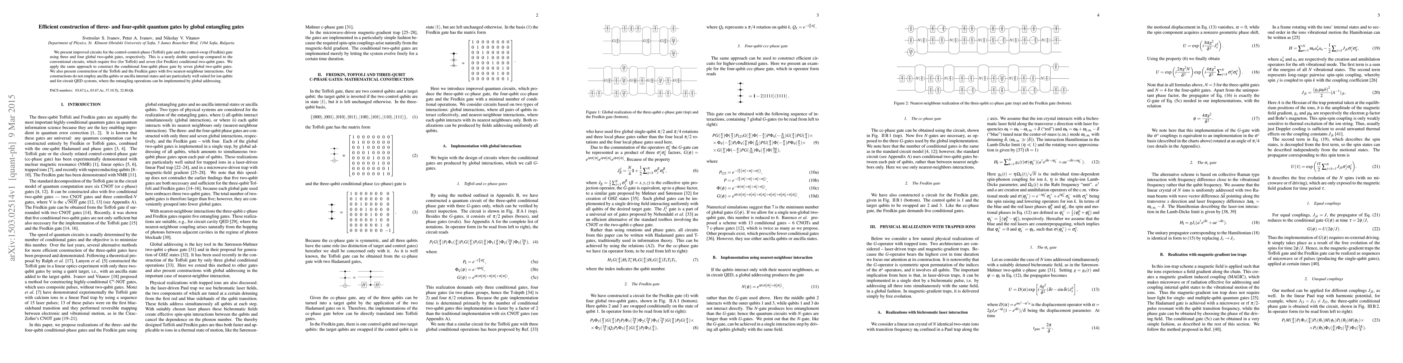 This paper introduces optimized circuits for three-qubit Toffoli and four-qubit Fredkin gates using fewer global two-qubit entangling gates, achieving nearly double the efficiency compared to traditional methods. The proposed designs also extend to a four-qubit phase gate and utilize minimal nearest-neighbor interactions, making them ideal for ion qubits and circuit QED systems.