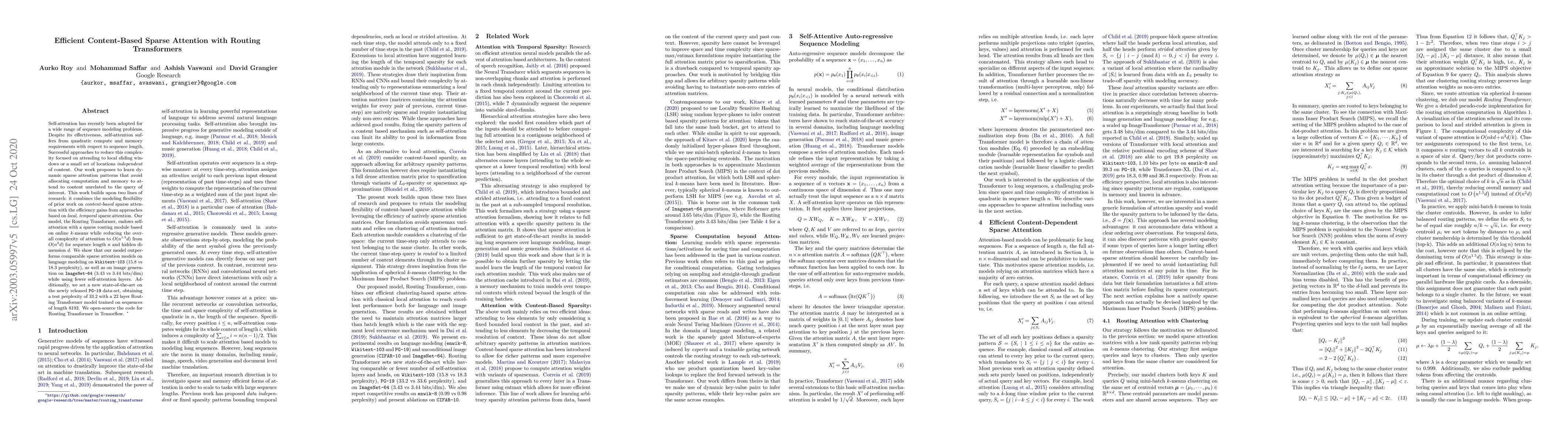 The paper proposes a Routing Transformer that combines content-based sparse attention with local sparse attention to reduce computational complexity from $O(n^2d)$ to $O(n^{1.5}d)$. The model outperforms other sparse attention models on language and image generation tasks, setting a new state-of-the-art on the PG-19 dataset.