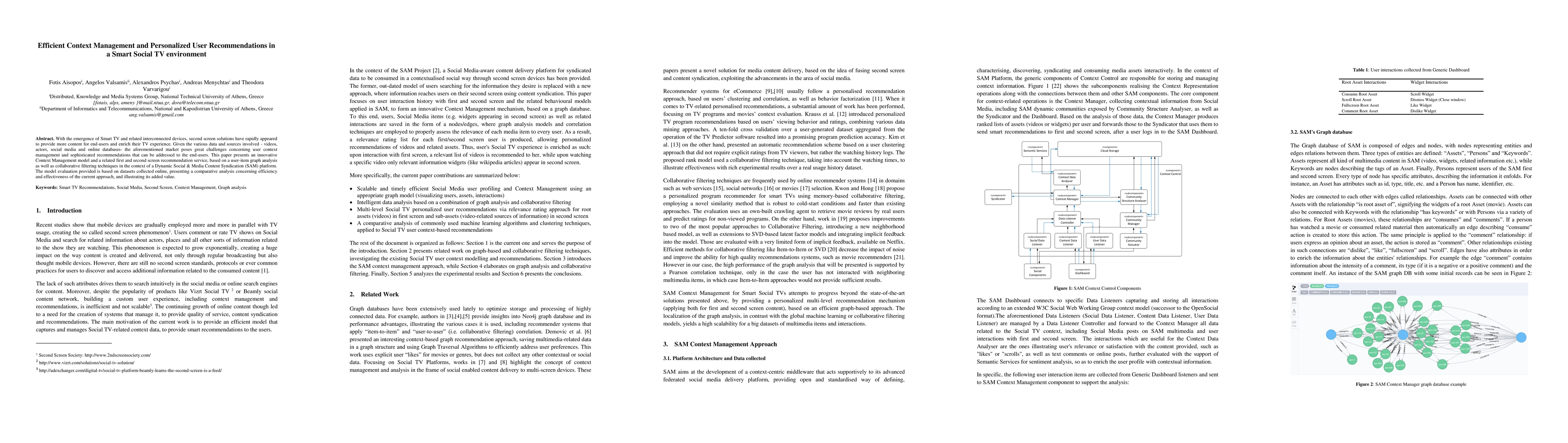 With the emergence of Smart TV and related interconnected devices, second screen solutions have rapidly appeared to provide more content for end-users and enrich their TV experience. Given the various data and sources involved - videos, actors, social media and online databases- the aforementioned market poses great challenges concerning user context management and sophisticated recommendations that can be addressed to the end-users. This paper presents an innovative Context Management model and a related first and second screen recommendation service, based on a user-item graph analysis as well as collaborative filtering techniques in the context of a Dynamic Social & Media Content Syndication (SAM) platform. The model evaluation provided is based on datasets collected online, presenting a comparative analysis concerning efficiency and effectiveness of the current approach, and illustrating its added value.