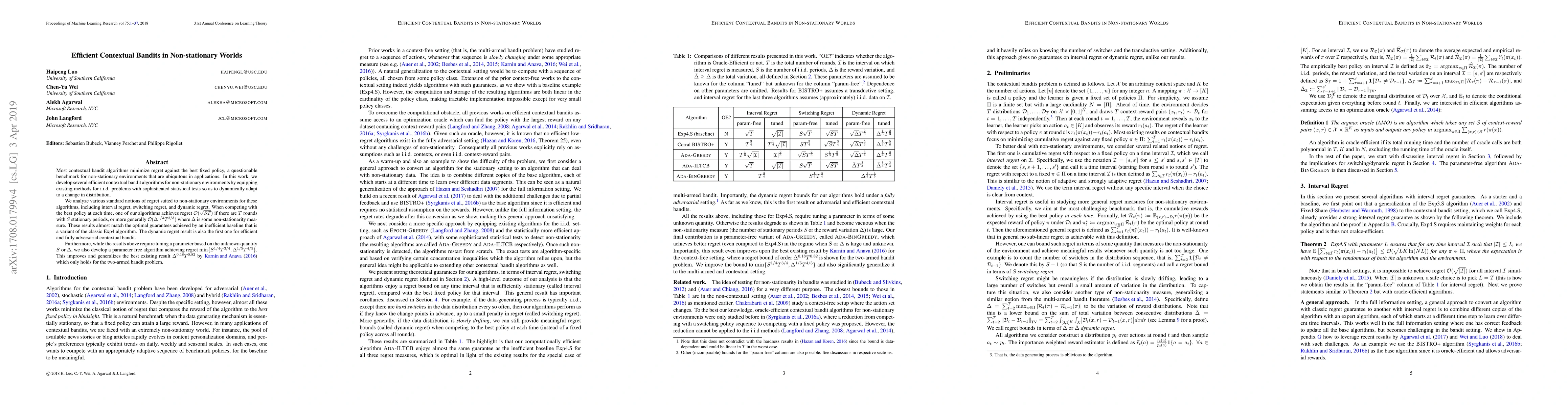 Researchers developed efficient contextual bandit algorithms for non-stationary environments, achieving near-optimal regret guarantees without requiring parameter tuning, improving upon existing results.