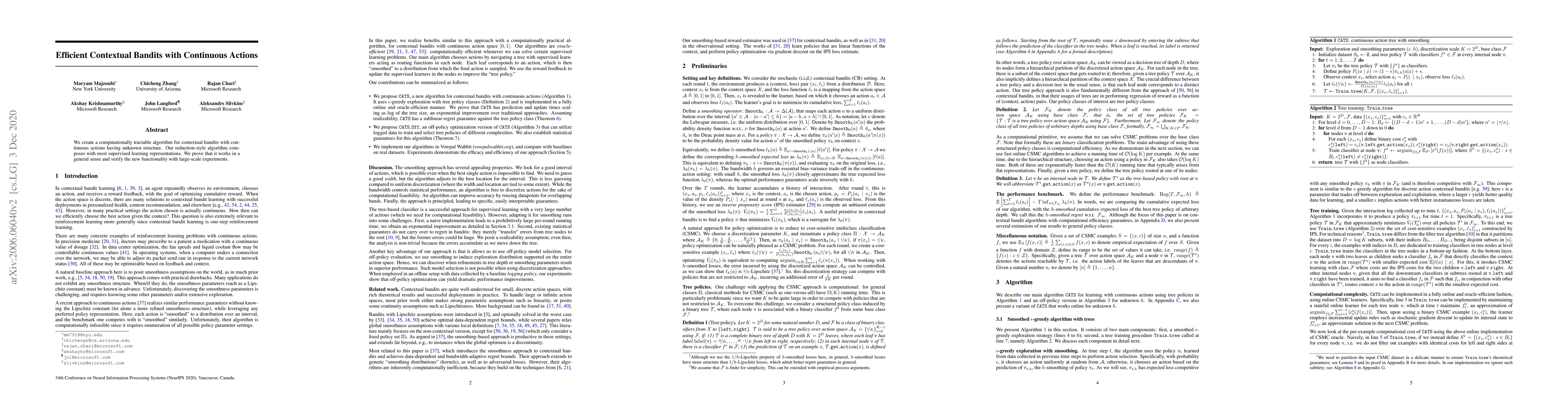 This paper introduces a computationally efficient algorithm for contextual bandits with continuous actions, demonstrating its general applicability and effectiveness through large-scale experiments. The algorithm is designed to work well with various supervised learning representations.