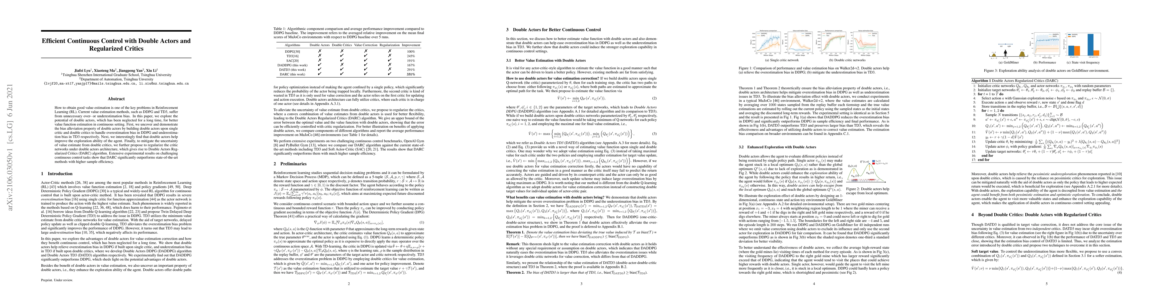 This paper proposes the Double Actors Regularized Critics (DARC) algorithm to improve value function estimation in continuous reinforcement learning. It leverages double actors to mitigate overestimation and underestimation biases in existing methods, enhances exploration, and regularizes critic networks to refine value estimates, achieving superior performance and sample efficiency.