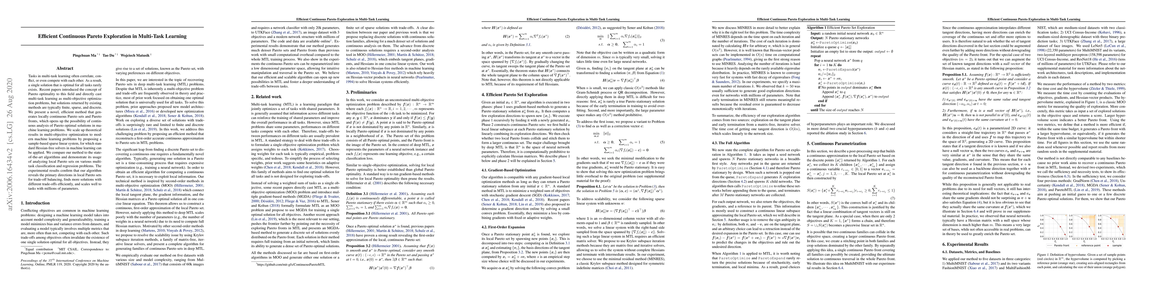 This paper introduces an efficient method for continuous exploration of Pareto optimality in multi-task learning, generating locally continuous Pareto sets and fronts. The proposed sample-based sparse linear system enables the application of standard Hessian-free solvers, and experimental results show improved efficiency and scalability for analyzing trade-offs in multi-task classification and regression problems.