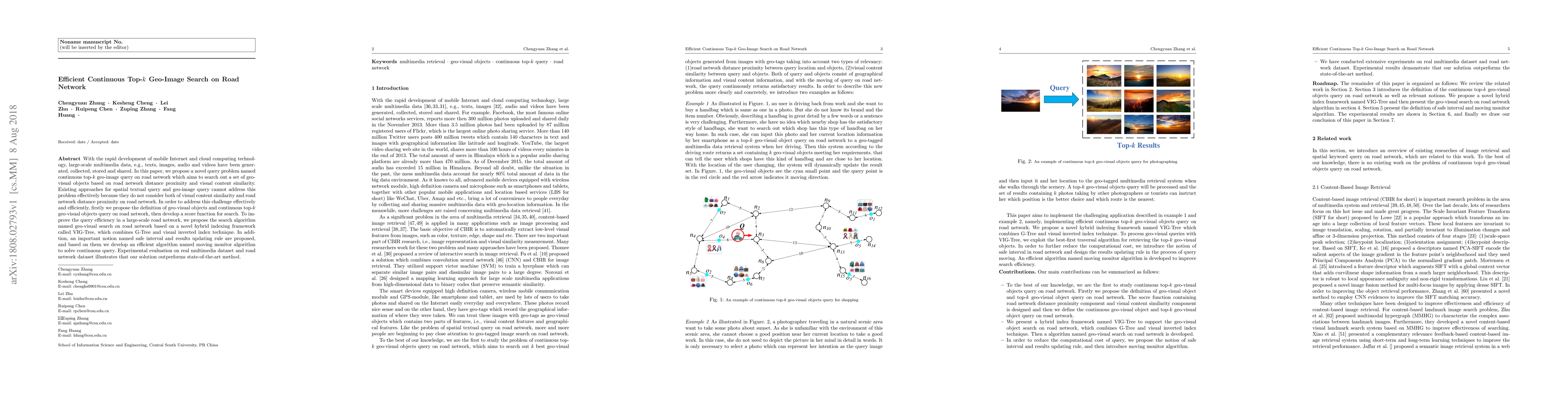 This paper introduces a novel continuous top-$k$ geo-image query method for road networks, combining both visual content similarity and road network distance. It proposes a hybrid indexing framework called VIG-Tree and a moving monitor algorithm to efficiently handle large-scale data and continuous queries, outperforming existing methods.