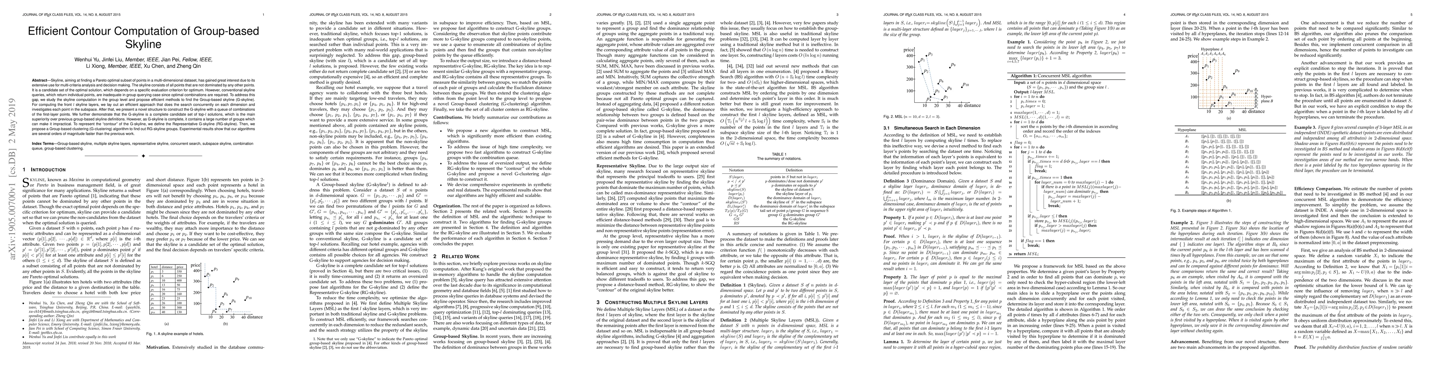 Skyline, aiming at finding a Pareto optimal subset of points in a multi-dimensional dataset, has gained great interest due to its extensive use for multi-criteria analysis and decision making. The skyline consists of all points that are not dominated by any other points. It is a candidate set of the optimal solution, which depends on a specific evaluation criterion for optimum. However, conventional skyline queries, which return individual points, are inadequate in group querying case since optimal combinations are required. To address this gap, we study the skyline computation in the group level and propose efficient methods to find the Group-based skyline (G-skyline). For computing the front $l$ skyline layers, we lay out an efficient approach that does the search concurrently on each dimension and investigates each point in the subspace. After that, we present a novel structure to construct the G-skyline with a queue of combinations of the first-layer points. We further demonstrate that the G-skyline is a complete candidate set of top-$l$ solutions, which is the main superiority over previous group-based skyline definitions. However, as G-skyline is complete, it contains a large number of groups which can make it impractical. To represent the "contour" of the G-skyline, we define the Representative G-skyline (RG-skyline). Then, we propose a Group-based clustering (G-clustering) algorithm to find out RG-skyline groups. Experimental results show that our algorithms are several orders of magnitude faster than the previous work.