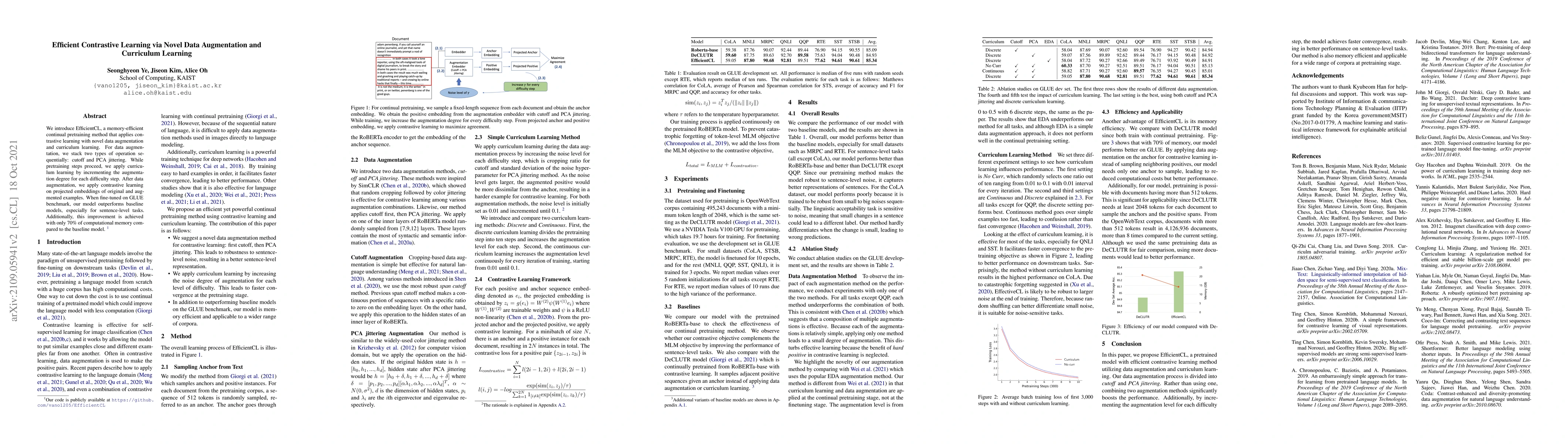 EfficientCL employs contrastive learning with innovative data augmentation and curriculum learning for memory-efficient continual pretraining. It stacks cutoff and PCA jittering for augmentation, gradually increasing complexity, and outperforms baselines on GLUE benchmarks while using only 70% of the computational memory.