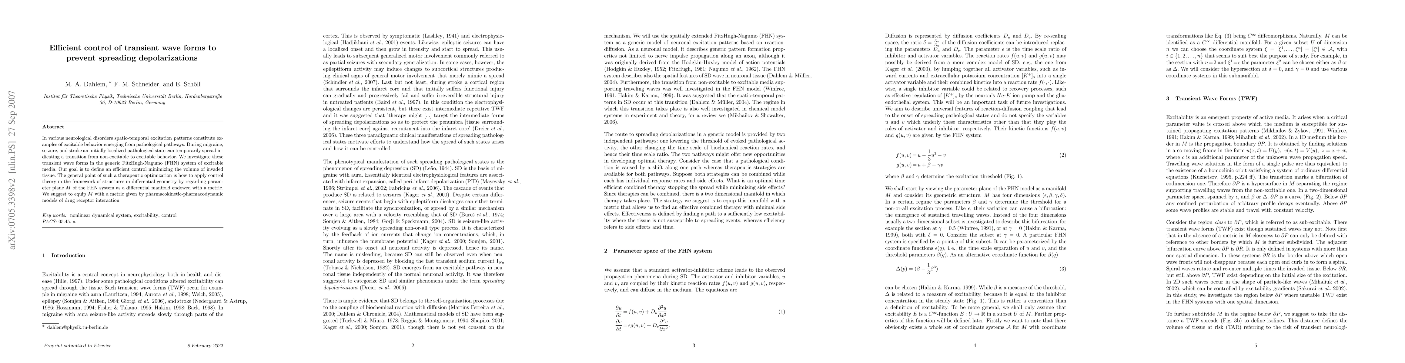 In various neurological disorders spatio-temporal excitation patterns constitute examples of excitable behavior emerging from pathological pathways. During migraine, seizure, and stroke an initially localized pathological state can temporarily spread indicating a transition from non-excitable to excitable behavior. We investigate these transient wave forms in the generic FitzHugh-Nagumo (FHN) system of excitable media. Our goal is to define an efficient control minimizing the volume of invaded tissue. The general point of such a therapeutic optimization is how to apply control theory in the framework of structures in differential geometry by regarding parameter plane M of the FHN system as a differential manifold endowed with a metric. We suggest to equip M with a metric given by pharmacokinetic-pharmacodynamic models of drug receptor interaction.