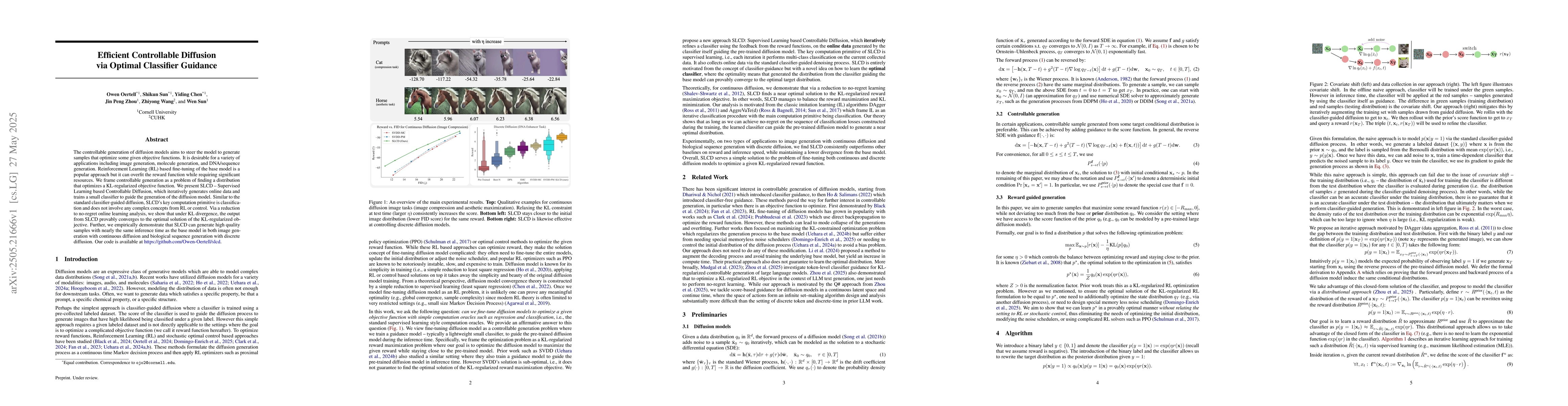 The controllable generation of diffusion models aims to steer the model to generate samples that optimize some given objective functions. It is desirable for a variety of applications including image generation, molecule generation, and DNA/sequence generation. Reinforcement Learning (RL) based fine-tuning of the base model is a popular approach but it can overfit the reward function while requiring significant resources. We frame controllable generation as a problem of finding a distribution that optimizes a KL-regularized objective function. We present SLCD -- Supervised Learning based Controllable Diffusion, which iteratively generates online data and trains a small classifier to guide the generation of the diffusion model. Similar to the standard classifier-guided diffusion, SLCD's key computation primitive is classification and does not involve any complex concepts from RL or control. Via a reduction to no-regret online learning analysis, we show that under KL divergence, the output from SLCD provably converges to the optimal solution of the KL-regularized objective. Further, we empirically demonstrate that SLCD can generate high quality samples with nearly the same inference time as the base model in both image generation with continuous diffusion and biological sequence generation with discrete diffusion. Our code is available at https://github.com/Owen-Oertell/slcd